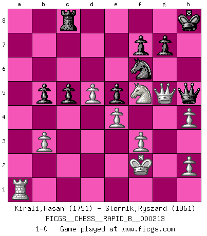 Last move : 1-0 2014 February 4 22:35:58 [Event "FICGS__CHESS__RAPID_B__000213"] [Site "FICGS"] [Date "2013.11.29"] [Round "1"] [White "Kirali,Hasan"] [Black "Sternik,Ryszard"] [Result "1-0"] [WhiteElo "1751"] [BlackElo "1861"] 1.c4 Nf6 2.Nf3 c5 3.Nc3 e6 4.g3 Nc6 5.Bg2 Qb6 6.O-O Be7 7.e3 O-O 8.d4 d6 9.b3 Rd8 10.d5 exd5 11.cxd5 Ne5 12.Nxe5 dxe5 13.Qd3 Bd7 14.Bb2 Rac8 15.Rfb1 a6 16.Nd1 Qb4 17.Bc3 Qg4 18.e4 Qh5 19.a4 Re8 20.f3 b5 21.Ne3 Bd8 22.Qd2 Bb6 23.axb5 axb5 24.Ra6 Rb8 25.Ba5 Bxa5 26.Rxa5 Red8 27.Rc1 Rbc8 28.Ra6 Qg6 29.Qe1 h5 30.Rca1 h4 31.gxh4 Qh5 32.Qg3 Kh8 33.Qg5 Kh7 34.Ra7 Kg8 35.Kf2 Kh8 36.Rxd7 Rxd7 37.Bh3 R7d8 38.Bxc8 Rxc8 39.Nf5 1-0 English Opening Kingside Castling by player White (move 6) Kingside Castling by player Black (move 7) Player White won this chess game. Follow this game move after move (download)The older I grow, the more I value Pawns. (Keres) Es hat in meinem Leben Zeiten gegeben, da ich sehr nahe daran war zu glauben, daß ich auch nicht eine einzige Schachpartie verlieren könnte. (José Raúl Capablanca) Un mal plan es mejor que no tener ningún plan. (Frank Marshall) On a dit que l'homme se distingue de l'animal par le fait qu'il achète plus de livres qu'il ne peut en lire. Je voudrais suggérer qu'inclure à la liste des livres quelques livres d'échecs rendrait la distinction manifeste. (Edward Lasker) Now you put water in a cup, it becomes the cup; You put water into a bottle it becomes the bottle; You put it in a teapot it becomes the teapot. Water can flow or it can crash. Be water, my friend. (Bruce Lee)
