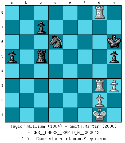 Last move : 1-0 2007 May 20 22:15:49 [Event "FICGS__CHESS__RAPID_A__000013"] [Site "FICGS"] [Date "2007.02.09"] [Round "1"] [White "Taylor,William"] [Black "Smith,Martin"] [Result "1-0"] [WhiteElo "1904"] [BlackElo "2000"] 1.e4 e5 2.Nf3 Nc6 3.Bb5 a6 4.Ba4 Nf6 5.O-O Nxe4 6.d4 b5 7.Bb3 d5 8.dxe5 Be6 9.Nbd2 Nc5 10.c3 d4 11.Bxe6 Nxe6 12.cxd4 Ncxd4 13.a4 Be7 14.Nxd4 Nxd4 15.Ne4 O-O 16.axb5 Nxb5 17.Be3 Qc8 18.Qc2 Qe6 19.f4 Rad8 20.Ra4 f6 21.exf6 Bxf6 22.f5 Qe5 23.Nxf6+ Qxf6 24.h3 Rf7 25.Re4 Qd6 26.Bg5 Qb6+ 27.Rf2 Rb8 28.Be3 Qb7 29.f6 gxf6 30.Rg4+ Kh8 31.Bg5 Qb6 32.Qc4 R7f8 33.Qf4 fxg5 34.Qe5+ Rf6 35.Qxf6+ Qxf6 36.Rxf6 Nd6 37.Re6 Rxb2 38.Rxg5 Rb5 39.Rg4 a5 40.Re7 Rc5 41.Reg7 h5 42.Rg8+ Kh7 43.R4g7+ Kh6 44.Rg3 1-0 This chess game has been lost on time (started : 2007.02.09 17:4:23) Ruy Lopez : Open, 7.Bb3 Kingside Castling by player White (move 5) Kingside Castling by player Black (move 15) Player White won this chess game. Follow this game move after move (download)Spassky will not be psyched out by Fischer. (Mike Goodall) Ein Springer auf f6 gegen die eigene Rochadestellung ist schlimmer als ein rostiger Nagel im Knie. (Efim Bogoljubov) En el tablero, la mentira e hipocresía no sobreviven mucho. (Emanuel Lasker) A chaque perte on perd un peu de soi. (Joël Lautier) Computer Science is no more about computers than astronomy is about telescopes. (Edsger W. Dijkstra)