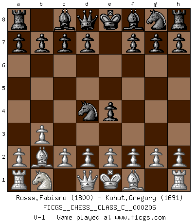 Last move : 0-1 2014 February 27 14:19:54 [Event "FICGS__CHESS__CLASS_C__000205"] [Site "FICGS"] [Date "2013.11.29"] [Round "1"] [White "Rosas,Fabiano"] [Black "Kohut,Gregory"] [Result "0-1"] [WhiteElo "1800"] [BlackElo "1691"] 1.b3 e5 2.Bb2 Nc6 3.Nf3 e4 4.Nd4 Nxd4 0-1 This chess game has been lost on time (started : 2013.11.29 4:44:47) Nimzovich-Larsen attack : Modern variation Player Black won this chess game. Follow this game move after move (download)I'd rather have a Pawn than a finger. (Reuben Fine) Obwohl ich alt bin, darf mir niemand den Finger in den Mund stecken, sonst beisse ich. (Wilhelm Steinitz) Bendita sea la memoria de aquel que dio al mundo este juego inmortal. (A. G. Gardiner) Tous ces prétendus hommes politiques sont les pions, les Cavaliers, les Tours ou les Fous d'une partie d'échecs qui se jouera tant qu'un hasard ne renversera pas l'échiquier. (Honoré de Balzac) Nobody is always a winner, and anybody who says he is, is either a liar or doesn't play poker. (Amarillo Slim)
