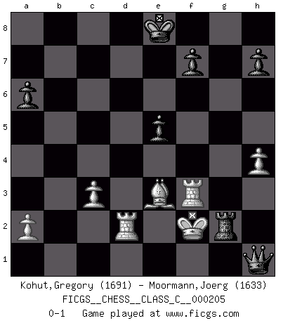 Last move : 0-1 2014 March 2 19:43:26 [Event "FICGS__CHESS__CLASS_C__000205"] [Site "FICGS"] [Date "2013.11.29"] [Round "1"] [White "Kohut,Gregory"] [Black "Moormann,Joerg"] [Result "0-1"] [WhiteElo "1691"] [BlackElo "1633"] 1.e4 c5 2.Nf3 d6 3.d4 cxd4 4.Nxd4 Nf6 5.Nc3 a6 6.Be3 e5 7.Nb3 Be6 8.Qd2 Nbd7 9.f4 b5 10.f5 Bc4 11.Bxc4 bxc4 12.Nc1 Rb8 13.b3 d5 14.exd5 Bb4 15.N1e2 Ne4 16.Nxe4 Bxd2+ 17.Nxd2 Rc8 18.O-O Nb6 19.bxc4 Nxc4 20.Nxc4 Rxc4 21.c3 Re4 22.Kf2 Qxd5 23.Rfd1 Qc6 24.Rac1 g6 25.Ng3 Ra4 26.Rd2 gxf5 27.Nxf5 Qf6 28.Rf1 Qxf5+ 29.Kg1 Qe4 30.Rf3 Rg8 31.Kf2 Qb1 32.g3 Qh1 33.h4 Rxh4 34.gxh4 Rg2+ 0-1 Sicilian : Najdorf, Byrne (English) attack Kingside Castling by player White (move 18) Player Black won this chess game. Follow this game move after move (download)Not all artists are Chess players, but all Chess players are artists. (Marcel Duchamp) Sicherlich können nur Meister einen Stil haben. Daß ein nicht-Meister auch nur ein einziges Mal in seinem Leben eine Partie folgerecht durchführte, habe ich niemals bemerkt. (Emanuel Lasker) Los problemas de Ajedrez exigen del compositor las mismas virtudes que caracterizan todo el arte de valor: originalidad, invención, concisión, armonía, complejidad e insinceridad explendida. (Vladimir Nabokov) Une platitude souvent récitée à propos des Echecs est qu'une des choses les plus difficiles à réaliser est de gagner une position gagnante. Cela ne manque pas de sens mais, pour ma part, j'ai toujours trouvé plus difficile de gagner une position perdante. (Tim Krabbe) For a mechanic, you seem to do an excessive amount of thinking. (C-3PO in Star Wars ep.2)