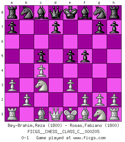 Last move : 0-1 2014 January 14 11:12:59 [Event "FICGS__CHESS__CLASS_C__000205"] [Site "FICGS"] [Date "2013.11.29"] [Round "1"] [White "Bey-Brahim,Reza"] [Black "Rosas,Fabiano"] [Result "0-1"] [WhiteElo "1800"] [BlackElo "1800"] 1.d4 f5 2.c4 e6 3.Nc3 b6 4.a3 c5 5.dxc5 bxc5 6.e3 e5 0-1 This chess game has been lost on time (started : 2013.11.29 4:44:47) Dutch defense, Rubinstein variation Player Black won this chess game. Follow this game move after move (download)In Fischer's hands, a slight theoretical advantage is as good a being a Queen ahead. (Isaac Kashdan) Es ist schade, dass viele Schachsportler vergessen, wie wichtig Auftreten und angemessene Kleidung sind. (Alexandra Kosteniuk) El sobresalir en el Ajedrez es un signo de una mente intrigante. (Sir Arthur Conan Doyle) Ce qui est bien, c'est d'avoir tout un tas de pièces en prise : l'adversaire ne peut en prendre qu'une à la fois. Cité par Thierry Audin. I know the human being and fish can coexist peacefully. (George W. Bush, Saginaw sept. 29, 2000)