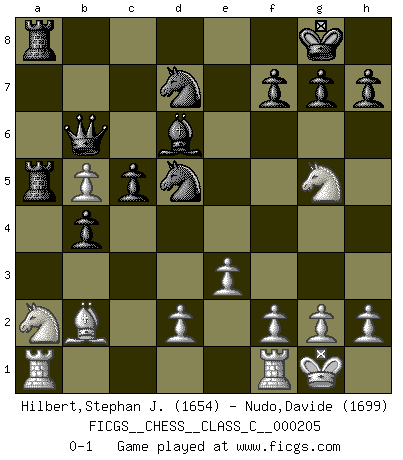 Last move : 0-1 2014 January 20 22:42:3 [Event "FICGS__CHESS__CLASS_C__000205"] [Site "FICGS"] [Date "2013.11.29"] [Round "1"] [White "Hilbert,Stephan J."] [Black "Nudo,Davide"] [Result "0-1"] [WhiteElo "1654"] [BlackElo "1699"] 1.b4 e5 2.Bb2 Nf6 3.b5 a6 4.Bxe5 axb5 5.e3 d6 6.Bb2 c6 7.Nf3 Nbd7 8.c4 bxc4 9.Bxc4 d5 10.Be2 Bd6 11.Nc3 O-O 12.O-O b5 13.a4 b4 14.Na2 c5 15.Bb5 Ba6 16.Qc2 Bxb5 17.axb5 Qb6 18.Qd3 Ra5 19.Ng5 Rfa8 20.Qxd5 Nxd5 0-1 Polish (Sokolsky) opening Kingside Castling by player Black (move 11) Kingside Castling by player White (move 12) Player Black won this chess game. Follow this game move after move (download)On the chessboard, lies and hypocrisy do not survive long. (Emanuel Lasker) Spielt Blackmar-Diemer-Gambit, und das Matt kommt von selbst! (Emil Joseph Diemer) Evita las multitudes. Haz independientemente tu propio razonamiento. Trata de ser el jugador de Ajedrez, no la pieza de Ajedrez. (Ralph Charell) Pour moi, les échecs ne sont pas un jeu mais un art. (Alexandre Alekhine) A woman without a man is like a fish without a bicycle. (Gloria Steinem)
