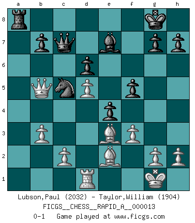 Last move : 0-1 2007 April 14 23:0:18 [Event "FICGS__CHESS__RAPID_A__000013"] [Site "FICGS"] [Date "2007.02.09"] [Round "1"] [White "Lubson,Paul"] [Black "Taylor,William"] [Result "0-1"] [WhiteElo "2032"] [BlackElo "1904"] 1.e4 c5 2.Nf3 d6 3.d4 cxd4 4.Nxd4 Nf6 5.Nc3 a6 6.Be3 e5 7.Nb3 Be6 8.Be2 Be7 9.Nd5 Nbd7 10.Qd3 O-O 11.O-O Bxd5 12.exd5 Nc5 13.Qd2 Nfe4 14.Qb4 a5 15.Qb5 Qc7 16.Rfd1 f5 17.f3 a4 18.Nxc5 Nxc5 19.b4 axb3 20.axb3 e4 21.Rxa8 Rxa8 0-1 This chess game has been lost on time (started : 2007.02.09 17:4:23) Sicilian : Najdorf, Byrne (English) attack Kingside Castling by player Black (move 10) Kingside Castling by player White (move 11) Player Black won this chess game. Follow this game move after move (download)One of these modest little moves may be more embarrassing to your opponent than the biggest threat. (Siegbert Tarrasch) Modernes Schach erfordert enorme Anspannung. Es ist für einen normalen Menschen unmöglich das auszuhalten. (Viktor Kortschnoi) El Ajedrez es una hermosa aventura. (Bent Larsen) On a dit que l'homme se distingue de l'animal par le fait qu'il achète plus de livres qu'il ne peut en lire. Je voudrais suggérer qu'inclure à la liste des livres quelques livres d'échecs rendrait la distinction manifeste. (Edward Lasker) 98% of all statistics are made up. (Author unknown)