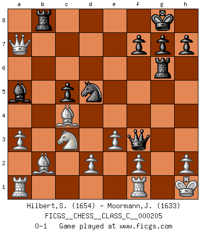 Last move : 0-1 2014 January 24 14:25:59 [Event "FICGS__CHESS__CLASS_C__000205"] [Site "FICGS"] [Date "2013.11.29"] [Round "1"] [White "Hilbert,Stephan J."] [Black "Moormann,Joerg"] [Result "0-1"] [WhiteElo "1654"] [BlackElo "1633"] 1.b4 e5 2.Bb2 Bxb4 3.Bxe5 Nf6 4.c4 O-O 5.e3 d5 6.cxd5 Nxd5 7.a3 Ba5 8.Nf3 Re8 9.Be2 c5 10.O-O Nc6 11.Bb2 Bf5 12.Qb3 a6 13.Bc4 Be4 14.Qxb7 Re6 15.Nc3 Bxf3 16.gxf3 Rb8 17.Qxa6 Ne5 18.Qa7 Nxf3+ 19.Kg2 Qg5+ 20.Kxf3 Qh5+ 21.Kg2 Rg6+ 22.Kh1 Qf3+ 0-1 Polish (Sokolsky) opening Kingside Castling by player Black (move 4) Kingside Castling by player White (move 10) Player Black won this chess game. Follow this game move after move (download)The way he plays Chess demonstrates a man's whole nature. (Stanley Ellin) Ich verachte die Medien. (Robert James Fischer) Los libros de Ajedrez deben de usarse igual como usamos los anteojos: para mejorar la vista, aunque algunos jugadores los quieren usar como si ellos les otorgaran la vision. (José Raúl Capablanca) Vous savez, camarade Pachman, je n'éprouve pas de plaisir à être ministre, je jouerais plutôt aux échecs comme vous, ou alors ferais une révolution au Venezuela. (Che Guevara à Ludek Pachman, 'Checkmate in Prague', 1975) Good luck. You're gonna need it. (Han Solo in Star Wars ep.6)