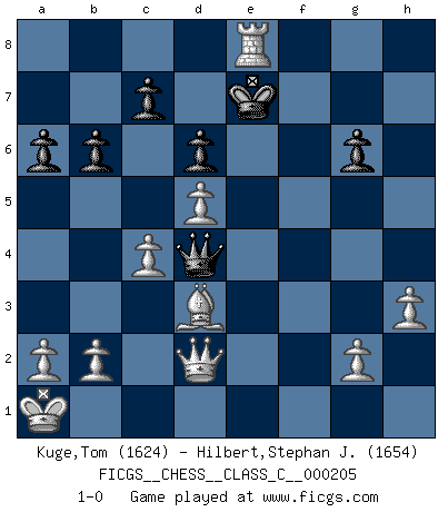 Last move : 1-0 2014 January 19 13:45:36 [Event "FICGS__CHESS__CLASS_C__000205"] [Site "FICGS"] [Date "2013.11.29"] [Round "1"] [White "Kuge,Tom"] [Black "Hilbert,Stephan J."] [Result "1-0"] [WhiteElo "1624"] [BlackElo "1654"] 1.c4 d6 2.Nc3 g6 3.e4 Bg7 4.Nge2 e5 5.d3 Ne7 6.Be3 O-O 7.Qd2 Nbc6 8.O-O-O f5 9.f4 fxe4 10.dxe4 exf4 11.Nxf4 Bg4 12.Re1 Ne5 13.h3 Bd7 14.Be2 Bc6 15.Ne6 Qd7 16.Nxf8 Rxf8 17.Rhf1 Qe6 18.Nd5 Qd7 19.Rxf8+ Kxf8 20.Bh6 a6 21.Qf4+ Nf7 22.Bxg7+ Kxg7 23.Qf6+ Kf8 24.Rf1 Ng8 25.Qh8 Bxd5 26.exd5 Qe7 27.Qxh7 Qe3+ 28.Kb1 Qe4+ 29.Ka1 Ngh6 30.Qxh6+ Ke7 31.Qd2 b6 32.Bd3 Qd4 33.Rxf7+ Kd8 34.Rf8+ Ke7 35.Re8+ 1-0 English Opening Kingside Castling by player Black (move 6) Queenside Castling by player White (move 8) Player White won this chess game. Follow this game move after move (download)There's never before been a Chess player with such a thorough knowledge of the intricacies of the game and such an absolutely indomitable will to win. I think Bobby is the greatest player that ever lived. (Lisa Lane) Besser ein falscher Plan, logisch durchgeführt, als gar kein Plan. (Viktor Kortschnoi) La partida mas dura de ganar es una partida ganada. (Emanuel Lasker) Mais l'homme est une créature légère et illogique : semblable au joueur d'échecs, il n'aime que le processus du but à atteindre, non le but lui-même. (Dostoïevsky) Before all elsed, be armed. (Niccolo Machiavelli)