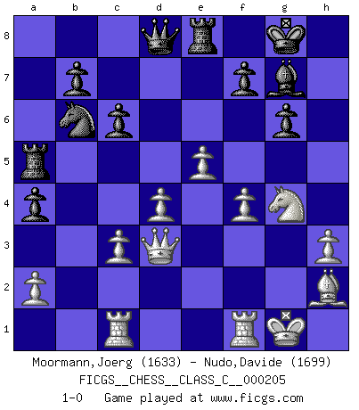 Last move : 1-0 2014 January 4 14:16:59 [Event "FICGS__CHESS__CLASS_C__000205"] [Site "FICGS"] [Date "2013.11.29"] [Round "1"] [White "Moormann,Joerg"] [Black "Nudo,Davide"] [Result "1-0"] [WhiteElo "1633"] [BlackElo "1699"] 1.d4 Nf6 2.c4 g6 3.Nc3 d5 4.Bf4 Bg7 5.e3 O-O 6.Rc1 c6 7.Nf3 Be6 8.Ng5 Bf5 9.Be2 h6 10.Nf3 dxc4 11.Bxc4 Nbd7 12.h3 Nb6 13.Bb3 Nbd5 14.Bh2 a5 15.O-O Nxc3 16.bxc3 h5 17.Ne5 e6 18.g4 Be4 19.f3 a4 20.Bxe6 Bd5 21.Bxd5 Nxd5 22.Qd3 Re8 23.e4 Nb6 24.f4 hxg4 25.Nxg4 Ra5 26.e5 1-0 King's Indian defense, 3.Nc3 Kingside Castling by player Black (move 5) Kingside Castling by player White (move 15) Player White won this chess game. Follow this game move after move (download)Chess is in its essence a game, in its form an art, and in its execution a science. (Baron Tassilo) Jeder weiß, dass Gasprom Putins persönliches Machtinstrument ist. Die Firma wird vom Kreml aus geleitet und wird schon deshalb nie transparent sein. (Garry Kasparov) Mi estilo es algo parecido entre un poco de Tal y Petrosian. (Reshevsky) Je menace de comprendre la position. (Anonyme) If everyone is thinking alike, then somebody isn't thinking. (US General George S. Patton)