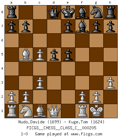 Last move : 1-0 2013 December 6 22:45:22 [Event "FICGS__CHESS__CLASS_C__000205"] [Site "FICGS"] [Date "2013.11.29"] [Round "1"] [White "Nudo,Davide"] [Black "Kuge,Tom"] [Result "1-0"] [WhiteElo "1699"] [BlackElo "1624"] 1.e4 c6 2.d4 d5 3.e5 c5 4.c3 Nc6 5.Nf3 Bg4 6.Be2 f6 7.h3 Be6 8.O-O Bf7 9.dxc5 Nxe5 10.Nxe5 fxe5 11.Bb5+ 1-0 Caro-Kann : Advance variation Kingside Castling by player White (move 8) Player White won this chess game. Follow this game move after move (download)A great player and a great example for many. His book My 60 Memorable Games had a big impact on me. It is a shame he didn't continue to enrich the world of chess with his unparalleled understanding after 1972. (Jan Timman, about Bobby Fischer's death) Ohne ihre Erfolge schmälern zu wollen würde ich sagen Petrosian, Spassky und Karpov verdanken ihre Siege ihren Trainern - Boleslavsky, Bondarevsky und Furman. (Mikhail Moiseyevich Botvinik) Solo el jugador con la iniciativa tiene el derecho a atacar. (Wilhelm Steinitz) J'ai vu le vaincu d'Echecs jouer des années durant dans l'espoir de la fête de la victoire. Car tu es plus riche de ce qu'elle existe si même elle n'est point pour toi. Ainsi de la perle du fond des mers. (Antoine de Saint-Exupéry) If I had no sense of humor, I would long ago have committed suicide. (Mahatma Gandhi)