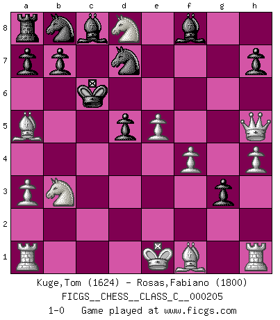 Last move : 1-0 2013 December 11 2:27:37 [Event "FICGS__CHESS__CLASS_C__000205"] [Site "FICGS"] [Date "2013.11.29"] [Round "1"] [White "Kuge,Tom"] [Black "Rosas,Fabiano"] [Result "1-0"] [WhiteElo "1624"] [BlackElo "1800"] 1.e4 c5 2.a3 e5 3.f4 exf4 4.Nf3 Nf6 5.e5 Nd5 6.c4 Nb6 7.b4 cxb4 8.d4 g5 9.h4 g4 10.Ng5 f3 11.gxf3 g3 12.f4 d5 13.c5 N6d7 14.Nxf7 Qa5 15.Nxh8 b3 16.Bd2 Qa4 17.Qh5+ Kd8 18.Nf7+ Kc7 19.Nc3 Qxd4 20.Nb5+ Kc6 21.Nxd4+ Kxc5 22.Nxb3+ Kb6 23.Ba5+ Kc6 24.Nd8+ 1-0 Sicilian defense Player White won this chess game. Follow this game move after move (download)When the Chess game is over, the Pawn and the King go back to the same box. (Irish saying) Frage: Gibt es etwas was Sie mehr lieben als Autobahnen ohne Tempobegrenzungen? - Antwort: Deutsche Frauen ohne Tempobegrenzungen. (Loek van Wely) Jugadores de primera clase pierden en contra de jugadores de segunda clase porque los jugadores de segunda clase a veces juegan una partida de primer clase. (Siegbert Tarrasch) Les erreurs sont comme les malheurs, elles n'arrivent jamais seules. (Siegbert Tarrasch) Internal peace cannot coexist with external war. (Don Groves)