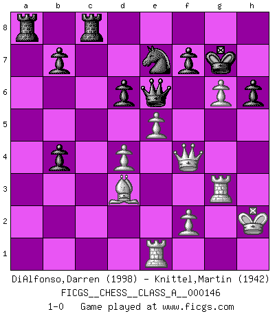Last move : 1-0 2014 March 13 4:52:35 [Event "FICGS__CHESS__CLASS_A__000146"] [Site "FICGS"] [Date "2013.11.29"] [Round "1"] [White "DiAlfonso,Darren"] [Black "Knittel,Martin"] [Result "1-0"] [WhiteElo "1998"] [BlackElo "1942"] 1.d4 Nf6 2.c4 e6 3.Nf3 d5 4.Nc3 h6 5.Bf4 Bd6 6.Bxd6 cxd6 7.cxd5 Nxd5 8.Nxd5 exd5 9.e3 Nc6 10.Bd3 O-O 11.O-O Qb6 12.Qd2 Bg4 13.Rac1 Rfc8 14.h3 Bxf3 15.gxf3 Ne7 16.Kh2 Kf8 17.Rce1 g6 18.Rg1 Qd8 19.Rg3 Kg7 20.h4 Qd7 21.e4 dxe4 22.fxe4 Qa4 23.b4 a5 24.Qf4 Qxa2 25.e5 Qe6 26.h5 axb4 27.hxg6 1-0 Queen's pawn game Kingside Castling by player Black (move 10) Kingside Castling by player White (move 11) Player White won this chess game. Follow this game move after move (download)Avoid the crowd. Do your own thinking independently. Be the Chess player, not the Chess piece. (Ralph Charell) Kein Großmeister ist normal. Sie unterscheiden sich nur im Ausmaß Ihrer Verrücktheit. (Viktor Kortschnoi) En un gambito tu regalas un Peón por el bién de tomar un juego perdido. (Samuel Standige Boden) Le plus grand jeu de l'esprit jamais inventé, plus vous l'apprenez, plus vous y prenez du plaisir. (Garry Kasparov) At last I discovered the true beauty of chess. So I proposed to her. (Dinesh De Silva)