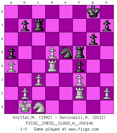 Last move : 1-0 2014 January 7 22:16:7 [Event "FICGS__CHESS__CLASS_A__000146"] [Site "FICGS"] [Date "2013.11.29"] [Round "1"] [White "Knittel,Martin"] [Black "Sorcinelli,Andrea"] [Result "1-0"] [WhiteElo "1942"] [BlackElo "2012"] 1.e4 c5 2.Nf3 d6 3.d4 cxd4 4.Nxd4 Nf6 5.Nc3 a6 6.Be3 e5 7.Nb3 Be7 8.f3 Be6 9.Qd2 O-O 10.O-O-O a5 11.a4 Nc6 12.g4 Nb4 13.Kb1 Qc7 14.g5 Nh5 15.Bb5 Rac8 16.Qf2 Bd8 17.Rd2 Qe7 18.Rhd1 Bc7 19.Qh4 g6 20.Nc1 f6 21.gxf6 Qxf6 22.Qxf6 Rxf6 23.Be2 Nf4 24.Bf1 Bb8 25.Nb5 d5 26.c3 Nc6 27.Bxf4 exf4 28.exd5 Bf5+ 29.Bd3 Ne5 30.Bxf5 Rxf5 31.Rf2 Bc7 32.Nxc7 Rxc7 33.Rd4 1-0 Sicilian : Najdorf, Byrne (English) attack Kingside Castling by player Black (move 9) Queenside Castling by player White (move 10) Player White won this chess game. Follow this game move after move (download)It is the aim of the modern school, not to treat every position according to one general law, but according to the principle inherent in the position. (Richard Reti) Korrekt heißt in Deutschland die Haltung eines Mannes, dessen Benehmen nach dem Urteile seiner Nachbarn seiner Stellung angemessen ist. Um korrekt zu sein, muß man sich der Meinung der anderen anpassen... (Emanuel Lasker) Bobby es la celebridad menos entendida y malinterpretada que camina el la faz de esta tierra. (Yasser Seirawan) La solitude du joueur d'Echecs à l'approche du mat est semblable à celle du condamné. (Francis Szpiner) The right perception of any matter and a misunderstanding of the same matter do not wholly exclude each other. (Kafka's the trial)