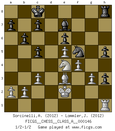 Last move : 1/2-1/2 2013 December 30 21:18:28 [Event "FICGS__CHESS__CLASS_A__000146"] [Site "FICGS"] [Date "2013.11.29"] [Round "1"] [White "Sorcinelli,Andrea"] [Black "Lommler,Jan Peter"] [Result "1/2-1/2"] [WhiteElo "2012"] [BlackElo "2012"] 1.e4 e5 2.Nf3 Nc6 3.Bb5 Nf6 4.O-O Nxe4 5.d4 Nd6 6.Bxc6 dxc6 7.dxe5 Nf5 8.Qxd8+ Kxd8 9.Nc3 Be6 10.Rd1+ Ke8 11.Ng5 Be7 12.Nxe6 fxe6 13.Ne4 b6 14.f4 Rd8 15.Rxd8+ Kxd8 16.Kf2 h6 17.Be3 Kc8 18.Rd1 g5 19.g3 c5 20.c3 g4 21.h3 h5 22.Ke2 gxh3 23.Rh1 1/2-1/2 Ruy Lopez : Berlin defense, Open variation Kingside Castling by player White (move 4) This chess game ended in a draw. Follow this game move after move (download)Bobby Fischer is the greatest Chess genius of all time ! (Alexander Kotov) Karpov ist ein Museumsstück. (Garry Kasparov) Solo el jugador con la iniciativa tiene el derecho a atacar. (Wilhelm Steinitz) Les Echecs, c'est l'art de la guerre sans les charniers, c'est la résurrection des morts tombés au champ d'honneur, l'espoir perpétuel, la suprématie de l'intelligence sur la force, la culture de l'esprit. (F. Szpiner) You can't play chess if you're groggy from pills. (Anatoly Karpov)
