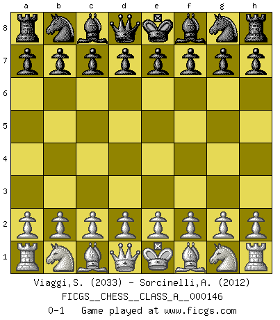 Last move : 0-1 2014 January 8 10:42:46 [Event "FICGS__CHESS__CLASS_A__000146"] [Site "FICGS"] [Date "2013.11.29"] [Round "1"] [White "Viaggi,Stefano"] [Black "Sorcinelli,Andrea"] [Result "0-1"] [WhiteElo "2033"] [BlackElo "2012"] 0-1 This chess game has been lost on time (started : 2013.11.29 5:17:35) Player Black won this chess game. Follow this game move after move (download)Discovered check is the dive bomber of the Chessboard. (Reuben Fine) Ich war zu klein für die Schach-Schülermannschaft! (Woody Allen) Debemos de asegurarnos de que el Ajedrez no se convierta en un lenguaje muerto, muy interesante, pero solo para un grupo muy pequeño. (Sytze Faber) Votre prénom est 'Tactique', votre deuxième prénom est 'Tactique' et votre nom est 'Tactique'. (Ken Smith) Information on the Internet is subject to the same rules and regulations as conversation at a bar. (George Lundberg)