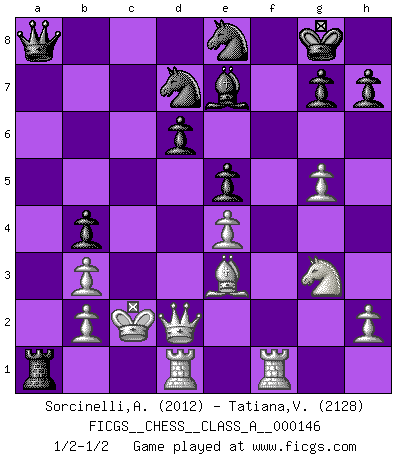 Last move : 1/2-1/2 2014 January 31 19:30:15 [Event "FICGS__CHESS__CLASS_A__000146"] [Site "FICGS"] [Date "2013.11.29"] [Round "1"] [White "Sorcinelli,Andrea"] [Black "Tatiana,Vanessa"] [Result "1/2-1/2"] [WhiteElo "2012"] [BlackElo "2128"] 1.e4 c5 2.Nf3 d6 3.d4 cxd4 4.Nxd4 Nf6 5.Nc3 a6 6.f3 e5 7.Nb3 Be7 8.Be3 Be6 9.Qd2 O-O 10.O-O-O Nbd7 11.g4 b5 12.g5 b4 13.Ne2 Ne8 14.f4 a5 15.f5 a4 16.fxe6 axb3 17.exf7+ Rxf7 18.cxb3 Rxa2 19.Kb1 Qa8 20.Ng3 Ra1+ 21.Kc2 Rxf1 22.Rhxf1 1/2-1/2 Sicilian : Najdorf Kingside Castling by player Black (move 9) Queenside Castling by player White (move 10) This chess game ended in a draw. Follow this game move after move (download)In order to improve your game, you must study the endgame before everything else, for whereas the endings can be studied and mastered by themselves, the middle game and the opening must be studied in relation to the endgame. (Jose Raul Capablanca) Am wohlsten fühle ich mich, wenn ich sehe, wie sich mein Gegner im Todeskampf windet. (Robert James Fischer) Jugadores de primera clase pierden en contra de jugadores de segunda clase porque los jugadores de segunda clase a veces juegan una partida de primer clase. (Siegbert Tarrasch) Mais l'homme est une créature légère et illogique : semblable au joueur d'échecs, il n'aime que le processus du but à atteindre, non le but lui-même. (Dostoïevsky) No man has ever achieved immortality in his own life time. (Unknown)