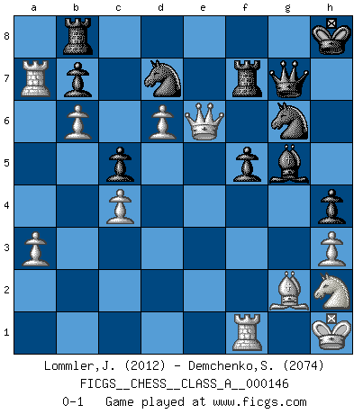 Last move : 0-1 2014 July 2 12:10:38 [Event "FICGS__CHESS__CLASS_A__000146"] [Site "FICGS"] [Date "2013.11.29"] [Round "1"] [White "Lommler,Jan Peter"] [Black "Demchenko,Sergey"] [Result "0-1"] [WhiteElo "2012"] [BlackElo "2074"] 1.d4 Nf6 2.c4 g6 3.g3 Bg7 4.Bg2 O-O 5.Nc3 d6 6.Nf3 Nc6 7.O-O a6 8.Qd3 e5 9.d5 Nb4 10.Qd1 a5 11.Bg5 h6 12.Be3 Qe7 13.h3 Bd7 14.Qd2 Kh7 15.a3 Na6 16.b4 Ne8 17.Rab1 f5 18.b5 Nb8 19.b6 c5 20.Qc2 Nf6 21.Bd2 e4 22.Nh2 Be8 23.Nb5 Bxb5 24.Rxb5 a4 25.Re1 Nbd7 26.Reb1 h5 27.Qc1 Ng8 28.f3 Bd4+ 29.e3 Bg7 30.f4 g5 31.Kh1 Nh6 32.Qc2 Bf6 33.Qd1 h4 34.g4 gxf4 35.exf4 e3 36.g5 exd2 37.Qxd2 Rae8 38.Ra5 Bd4 39.Qc2 Ng8 40.Ra7 Rb8 41.Qxa4 Qg7 42.Qd1 Ne7 43.Qh5+ Kg8 44.Qe2 Ng6 45.Qe6+ Kh8 46.Qxd6 Be3 47.Rf1 Rf7 48.Qe6 Bxf4 49.d6 Bxg5 0-1 This chess game has been lost on time (started : 2013.11.29 5:17:35) King's Indian : 3.g3 Kingside Castling by player Black (move 4) Kingside Castling by player White (move 7) Player Black won this chess game. Follow this game move after move (download)A win by an unsound combination, however showy, fills me with artistic horror. (Wilhelm Steinitz) Modernes Schach sorgt sich zuviel um Dinge wie Bauernstruktur usw. Vergessen Sie das, Schachmatt beendet das Spiel! (Nigel Short) Al jugar al Ajedrez entonces, podemos aprender: Primero: Previsión... Segundo: Prudencia... Tercero: Cautela... Y al final, aprendemos del Ajedrez el hábito de no ser desanimados por apariencias malas presentes en el estado de nuestros asuntos, el hábito de la esperanza por una oportunidad favorable y la perseveración de los secretos de los recursos. (Benjamin Franklin) A ce moment-là, je menaçais de comprendre la position ! (Clément L'Heureux) Programming can only do so much before it becomes too much. (Don Groves)