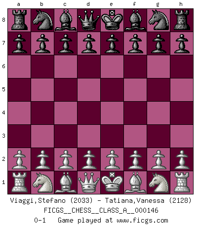 Last move : 0-1 2014 January 8 10:42:46 [Event "FICGS__CHESS__CLASS_A__000146"] [Site "FICGS"] [Date "2013.11.29"] [Round "1"] [White "Viaggi,Stefano"] [Black "Tatiana,Vanessa"] [Result "0-1"] [WhiteElo "2033"] [BlackElo "2128"] 0-1 This chess game has been lost on time (started : 2013.11.29 5:17:35) Player Black won this chess game. Follow this game move after move (download)After a bad opening, there is hope for the middle game. After a bad middle game, there is hope for the endgame. But once you are in the endgame, the moment of truth has arrived. (Edmar Mednis) Die westlichen Werte sind eine Sprache, welche die Putin-Administration nicht versteht. (Garry Kasparov) Con el fin de mejorar tu juego, debes de estudiar los finales antes que todo, ya que mientras que los finales pueden ser estudiados y dominados por sí mismos, el juegomedio y la apertura deben de ser estudiados en relación con los finales. (José Raúl Capablanca) Plusieurs personnes se sont demandées comment Tal faisait pour gagner... En fait, c'est très simple ! Il met ses pièces au centre de l'échiquier et les sacrifie quelque part ! (David Bronstein) When you don't know what to do, walk fast and look worried. (Anonymous)