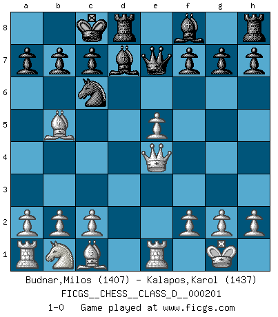 Last move : 1-0 2014 January 18 23:24:4 [Event "FICGS__CHESS__CLASS_D__000201"] [Site "FICGS"] [Date "2013.11.30"] [Round "1"] [White "Budnar,Milos"] [Black "Kalapos,Karol"] [Result "1-0"] [WhiteElo "1407"] [BlackElo "1437"] 1.e4 e5 2.Nf3 Nf6 3.Nxe5 Nxe4 4.Qe2 Qe7 5.Qxe4 d6 6.d4 dxe5 7.dxe5 Nc6 8.Bb5 Bd7 9.O-O O-O-O 10.Re1 1-0 This chess game has been lost on time (started : 2013.11.30 6:33:39) Petrov : Damiano variation Kingside Castling by player White (move 9) Queenside Castling by player Black (move 9) Player White won this chess game. Follow this game move after move (download)Blessed be the memory of him who gave the world this immortal game. (A. G. Gardiner) Ich verstehe den Grund nicht, warum die Aufteilung in Frauen und Männer überhaupt im Schach besteht. (Judith Polgar) No existe un remordimiento como el remordimiento del Ajedrez. (H. G. Wells) Les ravages du H expliquent la différence de niveau entre Tal et Thal [Abergel]. The difference between perseverance and obstinacy is that one comes from a strong will, and the other from a strong won't. (Henry Ward Beecher)