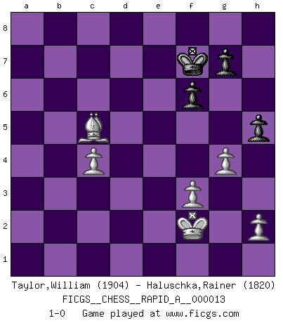 Last move : 1-0 2007 May 24 3:37:7 [Event "FICGS__CHESS__RAPID_A__000013"] [Site "FICGS"] [Date "2007.02.09"] [Round "1"] [White "Taylor,William"] [Black "Haluschka,Rainer"] [Result "1-0"] [WhiteElo "1904"] [BlackElo "1820"] 1.e4 c5 2.Nf3 d6 3.d4 cxd4 4.Nxd4 e5 5.Bb5+ Nd7 6.Nf5 a6 7.Ba4 Ngf6 8.Nxd6+ Bxd6 9.Qxd6 Qa5+ 10.Nc3 Nxe4 11.Qd5 Qxd5 12.Nxd5 O-O 13.Ne7+ Kh8 14.Nxc8 b5 15.Bxb5 axb5 16.Ne7 Rfe8 17.Nd5 Rec8 18.Nb4 Ndc5 19.O-O f6 20.Rd1 Rd8 21.Be3 Na4 22.b3 Nac3 23.Rd3 Rac8 24.f3 Ne2+ 25.Kf1 N4c3 26.Rxd8+ Rxd8 27.a4 bxa4 28.bxa4 Rb8 29.a5 Rxb4 30.a6 Rb8 31.a7 Ra8 32.Ra6 h5 33.Rb6 Kh7 34.Rb8 Rxa7 35.Bxa7 Nf4 36.Be3 Ne6 37.Re8 Nd5 38.Kf2 Ndc7 39.Re7 Kg8 40.Bc1 Kh7 41.Bd2 Kg8 42.c4 Kf8 43.Bb4 Na6 44.Bd6 Nec5 45.Rxe5 Kg8 46.Rxc5 Nxc5 47.Bxc5 Kf7 48.g4 1-0 Sicilian Kingside Castling by player Black (move 12) Kingside Castling by player White (move 19) 10 pieces endgame at move 47 : White KBPPPP , Black KPPP WHITE : King + 1 Bishop 4 Pawns BLACK : King + 3 Pawns Player White won this chess game. Follow this game move after move (download)All that matters on the Chessboard is good moves. (Bobby Fischer) Wer nie einen Fehler gemacht hat, hat nie etwas Neues ausprobiert. (Albert Einstein) Solo puedes ser bueno en el Ajedrez si amas al juego. (Bobby Fischer) C'est une question de caractère, Beaucoup de gens perdent leur motivation très vite. D'autres, ils sont rares, peuvent la conserver très longtemps. J'aime les échecs, encore aujourd'hui je suis heureux d'analyser des parties. J'aime toujours gagner, je déteste encore perdre. Bien jouer est important pour mon intégrité intellectuelle et morale. Et puis les échecs vivent en ce moment une période historique grâce à Internet. Ils se développent dans les systèmes éducatifs à travers le monde. Ils sortent de leur ghetto, et c'est mon rôle de mener à bien cette révolution. (Gary Kasparov) The human is the only animal species whose members are able to talk themselves into difficulties that would not otherwise exist. (Wendell Johnson)