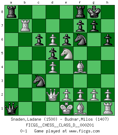 Last move : 0-1 2014 March 25 16:51:52 [Event "FICGS__CHESS__CLASS_D__000201"] [Site "FICGS"] [Date "2013.11.30"] [Round "1"] [White "Snaden,Ladane"] [Black "Budnar,Milos"] [Result "0-1"] [WhiteElo "1500"] [BlackElo "1407"] 1.d4 Nf6 2.c4 e6 3.c5 d5 4.Nc3 Nc6 5.Bf4 a6 6.Nf3 b5 7.b4 h6 8.Ne5 Bb7 9.a4 Nxb4 10.axb5 axb5 11.Rb1 Na2 12.Nxb5 c6 13.Nd6+ Bxd6 14.cxd6 O-O 15.Rxb7 Nc3 16.Qc1 Qa5 17.Qd2 Qa1+ 0-1 This chess game has been lost on time (started : 2013.11.30 6:33:39) Queen's pawn game Kingside Castling by player Black (move 14) Player Black won this chess game. Follow this game move after move (download)Fischer Chess play was always razor-sharp, rational and brilliant. One of the best ever. (Dave Regis) Wenn du gegen Bobby spielst, ist es keine Frage von gewinnen oder verlieren. Es ist eine Frage des Überlebens. (Boris Vassilievich Spassky) Existen dos clases de sacrificios: los correctos y los míos. (Mikhail Tal) Les échecs sont utiles à l'exercice de la faculté de penser et à celle de l'imagination. Car nous devons posséder une méthode élaborée pour atteindre des buts partout où nous devons conduire notre raison. (Leibnitz) It's not enough to succeed. Others must fail. (Gore Vidal)