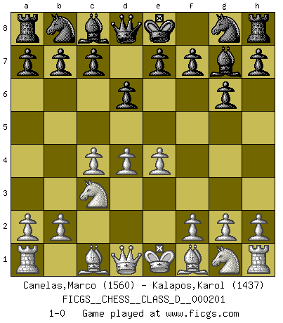 Last move : 1-0 2014 January 15 23:11:32 [Event "FICGS__CHESS__CLASS_D__000201"] [Site "FICGS"] [Date "2013.11.30"] [Round "1"] [White "Canelas,Marco"] [Black "Kalapos,Karol"] [Result "1-0"] [WhiteElo "1560"] [BlackElo "1437"] 1.d4 g6 2.c4 d6 3.Nc3 Bg7 4.e4 1-0 This chess game has been lost on time (started : 2013.11.30 6:33:39) Modern defense Player White won this chess game. Follow this game move after move (download)One of these modest little moves may be more embarrassing to your opponent than the biggest threat. (Siegbert Tarrasch) Im Wettkampf zwischen starken Meistern kommen Fehler sehr selten vor, deshalb ist es mit bloßem Warten nicht getan. (José Raúl Capablanca) En el Ajedrez, tal como es jugado por los Maestros, practicamente la suerte es eliminada. (Emanuel Lasker) À la honte des hommes, on sait que les lois du jeu sont les seules qui soient partout justes, claires, inviolables et exécutées. Pourquoi l'Indien qui a donné les règles du jeu d'échecs est-il obéi de bon gré dans toute la terre, et que les décrétales des papes, par exemple, sont aujourd'hui un objet d'horreur et de mépris ? C'est que l'inventeur des échecs combina tout avec justesse pour la satisfaction des joueurs, et que les papes, dans leurs décrétales, n'eurent en vue que leur seul avantage. L'Indien voulut exercer également l'esprit des hommes et leur donner du plaisir; les papes ont voulu abrutir l'esprit des hommes. Voltaire (Dictionnaire philosophique / Garnier 1967) Tree pose grows confidence. It roots me to this world. (Terri Guillemets)