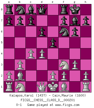 Last move : 0-1 2014 January 15 11:12:23 [Event "FICGS__CHESS__CLASS_D__000201"] [Site "FICGS"] [Date "2013.11.30"] [Round "1"] [White "Kalapos,Karol"] [Black "Cain,Maurie"] [Result "0-1"] [WhiteElo "1437"] [BlackElo "1600"] 1.c4 Nf6 2.Nf3 g6 3.b3 Bg7 4.Bb2 O-O 5.g3 d6 6.d4 e5 0-1 This chess game has been lost on time (started : 2013.11.30 6:33:39) English Opening Kingside Castling by player Black (move 4) Player Black won this chess game. Follow this game move after move (download)Chess is above all, a fight ! (Emanuel Lasker) Ein unbeabsichtigtes Patt ist der Gipfel der Dummheit. (Anonymous) Cuando la partida de Ajedrez termina, el Peón y el Rey regresan a la misma caja. (Irish saying) Ce qui caractérise les parties de combat, c'est que si le défenseur a constamment de difficiles problèmes à résoudre, l'attaquant doit chercher sans relâche de nouvelles possibilités d'attaque. (Koblentz) Rules and bones are meant to be broken. (Anonymous)