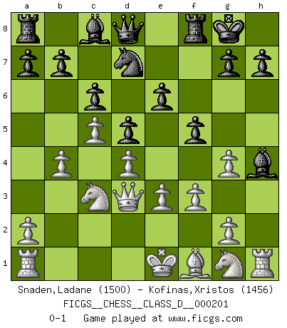 Last move : 0-1 2014 February 23 1:39:1 [Event "FICGS__CHESS__CLASS_D__000201"] [Site "FICGS"] [Date "2013.11.30"] [Round "1"] [White "Snaden,Ladane"] [Black "Kofinas,Xristos"] [Result "0-1"] [WhiteElo "1500"] [BlackElo "1456"] 1.d4 f5 2.c4 e6 3.c5 Nf6 4.Nc3 Be7 5.Bf4 d6 6.b4 O-O 7.f3 Nh5 8.Bg3 Nxg3 9.hxg3 d5 10.e3 c6 11.Qd3 Nd7 12.g4 Bh4+ 0-1 Dutch defense Kingside Castling by player Black (move 6) Player Black won this chess game. Follow this game move after move (download)No other master has such a terrific will to win. At the board he radiates danger, and even the strongest opponents tend to freeze, like rabbits when they smell a panther. Even his weaknesses are dangerous. As white, his opening game is predictable - you can make plans against it - but so strong that your plans almost never work. In the middle game his precision and invention are fabulous, and in the end game you simply cannot beat him. (Anonymous German Expert) Frage des Reporters: -Worin besteht das Ziel von Gambiteröffnungen? Antwort: -Auf Kosten der Partie einen Ruf als Angriffspieler zu erwerben.- (Siegbert Tarrasch) Los errores estan ahí, esperando a que se cometan. (Savielly Tartakower) Vous savez, camarade Pachman, je n'éprouve pas de plaisir à être ministre, je jouerais plutôt aux échecs comme vous, ou alors ferais une révolution au Venezuela. (Che Guevara à Ludek Pachman, 'Checkmate in Prague', 1975) Ah, the Socrating method. The best way we have of teaching everything-apart from juggling chainsaws. (Gregory House, House M.D.)