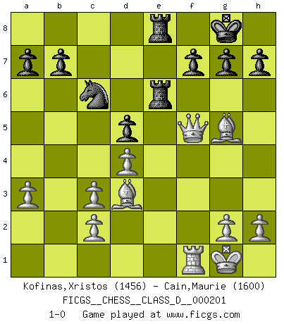Last move : 1-0 2014 February 6 15:40:0 [Event "FICGS__CHESS__CLASS_D__000201"] [Site "FICGS"] [Date "2013.11.30"] [Round "1"] [White "Kofinas,Xristos"] [Black "Cain,Maurie"] [Result "1-0"] [WhiteElo "1456"] [BlackElo "1600"] 1.e4 e5 2.f4 exf4 3.Nf3 Nf6 4.Nc3 c6 5.d4 d5 6.exd5 cxd5 7.Bxf4 Bb4 8.a3 Bxc3+ 9.bxc3 O-O 10.Bd3 Be6 11.O-O Nc6 12.Ne5 Bg4 13.Nxg4 Re8 14.Nxf6+ Qxf6 15.Qg4 Re6 16.Bg5 Qxf1+ 17.Rxf1 Rae8 18.Qf5 1-0 KGA : Schallop defense Kingside Castling by player Black (move 9) Kingside Castling by player White (move 11) Player White won this chess game. Follow this game move after move (download)I played Chess with him and would have beaten him sometimes only he always took back his last move, and ran the game out differently. (Mark Twain) Im Schach nämlich geht es darum, daß Ich des Gegners klein zu kriegen, sein Ego zu zerbrechen und zu zermahlen, seine Selbstachtung zu zertreten und zu verscharren und seine ganze mißachtenswerte sogenannte Persönlichkeit ein für alle Mal tot zu hacken und zu zerstampfen und dadurch die menschliche Gesellschaft von einer stinkenden Pestbeule zu befreien. Es ist ein königliches Spiel. (Robert James Fischer) Debemos de asegurarnos de que el Ajedrez no se convierta en un lenguaje muerto, muy interesante, pero tan solo para un grupo muy pequeño. (Sytze Faber) Mais n'est-ce pas déjà le limiter injurieusement que d'appeler les échecs un jeu? N'est-ce pas aussi une science, un art, ou quelque chose qui, comme le cercueil de Mahomet entre ciel et terre, est suspendu entre l'un et l'autre, et qui réunit un nombre incroyable de contraires ? (Stefan Zweig) Methinks King Thibault should dub Marius Zubac a knight of the square board... I mean table, henceforth addressing him as Sir Marius, and bestow on him a suitable land from the kingdom of FICGS & marry him off to a worthy, fair maiden, lest he slice our heads with his mighty sword in his wrath. (Dinesh De Silva)