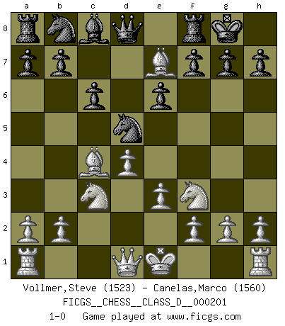 Last move : 1-0 2014 January 10 10:46:0 [Event "FICGS__CHESS__CLASS_D__000201"] [Site "FICGS"] [Date "2013.11.30"] [Round "1"] [White "Vollmer,Steve"] [Black "Canelas,Marco"] [Result "1-0"] [WhiteElo "1523"] [BlackElo "1560"] 1.d4 d5 2.c4 e6 3.Nc3 Nf6 4.Nf3 Be7 5.Bg5 O-O 6.e3 c6 7.Bd3 dxc4 8.Bxc4 Nd5 9.Bxe7 1-0 This chess game has been lost on time (started : 2013.11.30 6:33:39) QGD : 4.Nf3 Kingside Castling by player Black (move 5) Player White won this chess game. Follow this game move after move (download)There must have been a time when men were demigods, or they could not have invented Chess. (Gustav Schenk) Habe Mut, dich deines eigenen Verstandes zu bedienen. (Immanuel Kant) Una mala movida nulifica cuarenta buenas. (Horowitz) Même si vous avez un bon coup à faire, regardez toujours s'il n'y en a pas un qui lui soit préférable. (Pedro Damiano) Success without honor is an unseasoned dish; it will satisfy your hunger, but it won't taste good. (Joe Paterno)