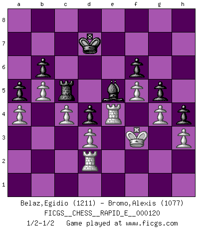 Last move : 1/2-1/2 2014 February 6 19:12:22 [Event "FICGS__CHESS__RAPID_E__000120"] [Site "FICGS"] [Date "2013.12.01"] [Round "1"] [White "Belaz,Egidio"] [Black "Bromo,Alexis"] [Result "1/2-1/2"] [WhiteElo "1211"] [BlackElo "1077"] 1.e4 e5 2.Nf3 Nc6 3.Nc3 Nf6 4.Bc4 h6 5.a4 a6 6.b3 Bb4 7.Nd5 Nxd5 8.exd5 Nd4 9.c3 Nxf3+ 10.Qxf3 Bd6 11.b4 O-O 12.O-O c6 13.b5 cxd5 14.Qxd5 Be7 15.Qxe5 d6 16.Qe4 Re8 17.Bd3 g6 18.Bb2 Bf5 19.Qf3 Bxd3 20.Qxd3 d5 21.Qd4 Bf6 22.Qd3 a5 23.Ba3 b6 24.h3 Rc8 25.Rad1 d4 26.c4 Kg7 27.Bb2 Rc5 28.Ba3 Rce5 29.f4 R5e7 30.Bxe7 Rxe7 31.f5 g5 32.Rf3 Qd6 33.R3f1 Qb4 34.Qc2 Qc5 35.d3 Be5 36.Rf2 f6 37.Kh1 Bg3 38.Rf3 Be5 39.Re1 Kf7 40.Qb3 h5 41.g4 h4 42.Re2 Kg7 43.Re4 Kf7 44.Rf1 Kg7 45.Ra1 Kf7 46.Qa3 Qxa3 47.Rxa3 Rc7 48.Ra2 Rc5 49.Rae2 Ke7 50.Kg2 Kd6 51.Kf3 Kd7 52.Rd2 1/2-1/2 Four knights : Italian variation Kingside Castling by player Black (move 11) Kingside Castling by player White (move 12) This chess game ended in a draw. Follow this game move after move (download)War is the child of passion, passion is the child of narcissism and narcissism is the child. (...) Another game ? (Thibault de Vassal) Meine Liebe ist Schach, Schach, Schach. Ich muss jeden Tag Schach spielen, deshalb fühle ich mich so stark. (Miguel Najdorf) No hay un Gran Maestro de Ajedrez que sea normal; solo se diferencían ellos por la magnitud de su locura. (Viktor Korchnoi) La guerre est enfant de la passion, la passion est enfant du narcissisme et le narcissisme est l'enfant. (...) Une autre partie ? (Thibault de Vassal) It's unlucky to be superstitious. (Dave Enteles)