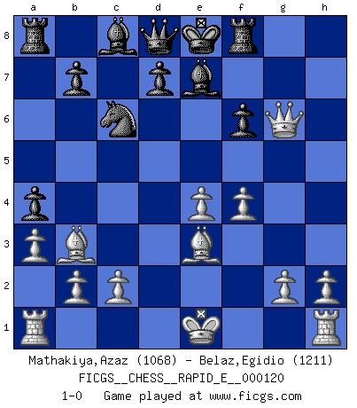 Last move : 1-0 2014 January 19 18:43:41 [Event "FICGS__CHESS__RAPID_E__000120"] [Site "FICGS"] [Date "2013.12.01"] [Round "1"] [White "Mathakiya,Azaz"] [Black "Belaz,Egidio"] [Result "1-0"] [WhiteElo "1068"] [BlackElo "1211"] 1.e4 c5 2.Nf3 Nc6 3.d4 cxd4 4.Nxd4 Nxd4 5.Qxd4 e6 6.Bc4 Ne7 7.Bh6 f6 8.Be3 Nc6 9.Qd1 Be7 10.Nc3 Bb4 11.Qd2 Ne5 12.Bb3 a5 13.a3 Be7 14.Nd5 exd5 15.Qxd5 Rf8 16.f4 Nc6 17.Qh5+ g6 18.Qxh7 a4 19.Qxg6+ 1-0 Sicilian defense Player White won this chess game. Follow this game move after move (download)I'm not afraid of Spassky. The world knows I'm the best. You don't need a match to prove it. (Bobby Fischer) Ohne Fehler kann es keine Brillanz geben. (Emanuel Lasker) Después de una mala apertura, hay una esperanza en el juego medio. Pero una vez que estas en finales, el momento de la verdad ha llegado. (Edmar Mednis) Assurément je connaissais par expérience le mystérieux attrait de ce jeu royal, le seul entre tous les jeux inventés par les hommes qui échappe souverainement à la tyrannie du hasard, le seul où l'on ne doive sa victoire qu'à son intelligence ou plutôt à une certaine forme d'intelligence. Mais n'est-ce pas déjà le limiter injurieusement que d'appeler les échecs un jeu ? N'est-ce pas une science, un art ou quelque chose qui, comme le cercueil de Mahomet entre ciel et terre, est suspendu entre l'un et l'autre, et qui réunit un nombre incroyable de contraires ? [...] C'est une pensée qui ne mène à rien, une mathématique qui n'établit rien, un art qui ne laisse pas d'uvre, une architecture sans matière; et il l'a prouvé néanmoins qu'il était plus durable, à sa manière, que les livres ou que tout autre monument, ce jeu unique qui appartient à tous les peuples et à tous les temps, et dont personne ne sait quel dieu en fit don à la terre pour tuer l'ennui, pour aiguiser l'esprit et stimuler l'âme. Où commence-t-il, où finit-il ? (Stefan Zweig) You must do what you feel is right... of course. (Obi-Wan Kenobi in Star Wars ep.4)