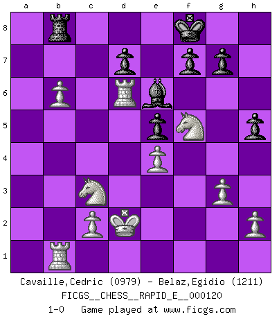 Last move : 1-0 2013 December 26 19:35:43 [Event "FICGS__CHESS__RAPID_E__000120"] [Site "FICGS"] [Date "2013.12.01"] [Round "1"] [White "Cavaille,Cedric"] [Black "Belaz,Egidio"] [Result "1-0"] [WhiteElo "0979"] [BlackElo "1211"] 1.e4 c5 2.Nf3 e6 3.d4 cxd4 4.Nxd4 e5 5.Nf3 Nc6 6.Bb5 Qa5+ 7.Nc3 Bb4 8.Bxc6 bxc6 9.Bd2 Nf6 10.Qe2 Ba6 11.Qe3 O-O 12.a3 Bd6 13.Ng5 Qd8 14.Qh3 h6 15.Nf3 Bc4 16.O-O-O Be6 17.Qg3 Nh5 18.Qh4 Qxh4 19.Nxh4 Nf4 20.g3 Nh3 21.Be3 Bg4 22.Rxd6 Rad8 23.Bxa7 Nxf2 24.Bxf2 Be6 25.Bc5 Rfe8 26.a4 Ra8 27.b4 Red8 28.b5 cxb5 29.axb5 Ra1+ 30.Nb1 Ra5 31.Bb6 R5a8 32.Bxd8 Rxd8 33.Kd2 Ra8 34.Nc3 Rb8 35.b6 Kf8 36.Nf5 h5 37.Rb1 1-0 Sicilian defense Kingside Castling by player Black (move 11) Queenside Castling by player White (move 16) Player White won this chess game. Follow this game move after move (download)I played Chess with him and would have beaten him sometimes only he always took back his last move, and ran the game out differently. (Mark Twain) Das Schachspiel übertrifft alle anderen Spiele so weit wie der Chimborasso einen Misthaufen. (Arthur Schopenhauer) La táctica fluye a partir de una posición superior. (Bobby Fischer) Les Echecs ont trois composantes : le temps, l'espace et le matériel en dernier. (Mikhail Tal) Convictions are more dangerous enemies of truth than lies. (Friedrich Nietzsche)