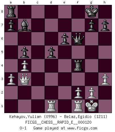 Last move : 0-1 2014 March 28 5:10:4 [Event "FICGS__CHESS__RAPID_E__000120"] [Site "FICGS"] [Date "2013.12.01"] [Round "1"] [White "Kehayov,Yulian"] [Black "Belaz,Egidio"] [Result "0-1"] [WhiteElo "0996"] [BlackElo "1211"] 1.e4 c5 2.Bc4 Nc6 3.Nf3 Nf6 4.Nc3 e6 5.O-O Be7 6.d4 O-O 7.e5 Ne8 8.dxc5 Bxc5 9.Qe1 Nb4 10.Qd2 f6 11.a3 Nc6 12.b4 Be7 13.Qd3 fxe5 14.Qe3 Bf6 15.Bb2 Nd6 16.h3 Nxc4 17.Qc1 Nd4 18.Nxd4 exd4 19.Ne4 Nxb2 20.Qxb2 d3 21.Nxf6+ Rxf6 22.cxd3 d5 23.Rfe1 b5 24.d4 Bb7 25.Rac1 Qe7 26.Qb3 Rf4 27.Red1 Qf6 28.Rf1 Qxd4 29.Rcd1 Qf6 0-1 Sicilian defense Kingside Castling by player White (move 5) Kingside Castling by player Black (move 6) Player Black won this chess game. Follow this game move after move (download)Tactics flow from a superior position. (Bobby Fischer) Irgendwie scheint mir sonntags früh um 9 Uhr der Killerinstinkt verloren gegangen zu sein. (Alexej Shirov) Después de la respuesta de las negras a 1.e4 con 1..e5, se quedan siempre tratando de entrar dentro del juego. (Howard Staunton) Dans le domaine de la peinture, de la gravure et de la sculpture, dès la première décennie de notre siècle, les artistes abandonnent la représentation de la partie d'échecs pour se concentrer sur les pièces, sur les échiquiers et sur toutes les variations auxquelles les unes et les autres peuvent donner lieu. On passe en quelque sorte d'un thème social à un thème musical (au sens de la musica médiévale, c'est-à-dire d'une notion qui inclue le rythme, l'harmonie, la construction et la déconstruction, etc.). Graphiquement et picturalement, l'échiquier apparaît comme une structure ouverte, dynamique, d'une richesse infinie, autorisant toutes les combinatoires et débouchant sur des mouvements et des rythmes de nature exponentielle. (Michel Pastoureau) The absolute truth is the thing that makes people laugh. (Carl Reiner)