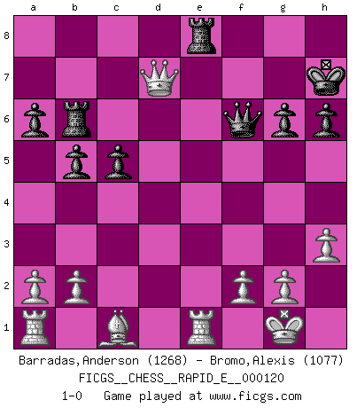 Last move : 1-0 2013 December 5 21:26:41 [Event "FICGS__CHESS__RAPID_E__000120"] [Site "FICGS"] [Date "2013.12.01"] [Round "1"] [White "Barradas,Anderson"] [Black "Bromo,Alexis"] [Result "1-0"] [WhiteElo "1268"] [BlackElo "1077"] 1.e4 e5 2.Nf3 Nc6 3.Bb5 d6 4.O-O h6 5.h3 Bd7 6.c3 Nf6 7.Re1 a6 8.Ba4 b5 9.Bb3 Be7 10.d4 exd4 11.Nxd4 Nxd4 12.cxd4 c5 13.e5 dxe5 14.dxe5 Nh7 15.Bd5 Rb8 16.e6 fxe6 17.Qh5+ Kf8 18.Bf3 Nf6 19.Qe5 Nd5 20.Bxd5 exd5 21.Qxd5 Rb6 22.Qf3+ Bf6 23.Nc3 Kg8 24.Qg3 Kh7 25.Ne4 Re8 26.Qd3 g6 27.Nxf6+ Qxf6 28.Qxd7+ 1-0 Ruy Lopez : Old Steinitz defense Kingside Castling by player White (move 4) Player White won this chess game. Follow this game move after move (download)It is difficult to play against Einstein's theory --on his first loss to Fischer. (Mikhail Tal) Es ist nicht das erste mal, dass sich die FIDE dem Arabischen Geld gebeugt hat (über die FIDE WM 2004 in Lybien). (Larry Evans) Te sientas frente a un tablero y repentinamente tu corazón brinca. Tu mano tiembla al tomar una pieza y moverla. Pero lo que el Ajedrez te enseña es que tu debes permanecer ahí con calma y pensar de que si realmente es una buena idea o de que si hay otras ideas mejores. (Stanley Kubrick) Les sacrifices démontrent seulement que quelqu'un a gaffé. (Savielly Tartacover) How many people work in NATO Headquarters ? - About half of them. (Dirk Stikker, NATO general secretary)