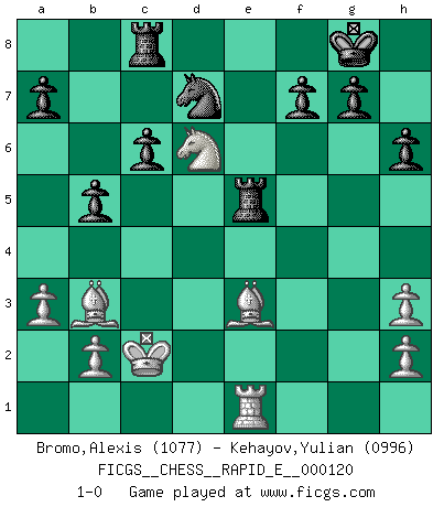 Last move : 1-0 2014 March 29 5:42:37 [Event "FICGS__CHESS__RAPID_E__000120"] [Site "FICGS"] [Date "2013.12.01"] [Round "1"] [White "Bromo,Alexis"] [Black "Kehayov,Yulian"] [Result "1-0"] [WhiteElo "1077"] [BlackElo "0996"] 1.d4 d5 2.c4 dxc4 3.Nc3 e5 4.a3 exd4 5.Ne4 Nf6 6.Ng5 h6 7.Qa4+ Qd7 8.Qxd7+ Bxd7 9.N5f3 Bc5 10.Nh3 O-O 11.e3 dxe3 12.fxe3 Re8 13.Kd2 Ng4 14.Bxc4 Bxe3+ 15.Kc2 Nf2 16.Bxe3 Nxh1 17.Rxh1 c6 18.Re1 Bxh3 19.gxh3 b5 20.Bb3 Nd7 21.Nd4 Rac8 22.Nf5 Re5 23.Nd6 1-0 Queen's gambit accepted Kingside Castling by player Black (move 10) Player White won this chess game. Follow this game move after move (download)Of Chess it has been said that life is not long enough for it, but that is the fault of life, not Chess. (William Ewart Napier) Ich verachte die Medien. (Robert James Fischer) En manos de Fischer's, una diminuta ventaja teórica es tan buena como tener una Reina de ventaja. (Isaac Kashdan) Votre prénom est 'Tactique', votre deuxième prénom est 'Tactique' et votre nom est 'Tactique'. (Ken Smith) To send light into the darkness of men's hearts - such is the duty of the artist. (Schumann)