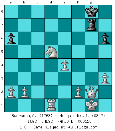 Last move : 1-0 2014 January 5 22:44:45 [Event "FICGS__CHESS__RAPID_E__000120"] [Site "FICGS"] [Date "2013.12.01"] [Round "1"] [White "Barradas,Anderson"] [Black "Melquiades,Jay"] [Result "1-0"] [WhiteElo "1268"] [BlackElo "0842"] 1.e4 e5 2.Nf3 d6 3.h3 a6 4.d4 c5 5.dxc5 Nc6 6.cxd6 Bxd6 7.Bc4 Nd4 8.Nxd4 exd4 9.O-O Bc5 10.Qf3 Nf6 11.Bg5 h6 12.Bh4 Be6 13.Bxe6 fxe6 14.e5 d3 15.cxd3 Qd4 16.exf6 Qxh4 17.fxg7 Rg8 18.Qxb7 Ra7 19.Qc6+ Kf7 20.Qxc5 Re7 21.Nc3 Rxg7 22.Qe3 e5 23.Nd5 Re6 24.Qf3+ Kg8 25.Rae1 e4 26.Rxe4 Rxe4 27.dxe4 Qg5 28.Rd1 Qxg2+ 29.Qxg2 1-0 Philidor's defense Kingside Castling by player White (move 9) Player White won this chess game. Follow this game move after move (download)Bobby just drops the pieces and they fall on the right squares. (Miguel Najdorf) Frage: Was machen Sie mit den Preisen? Anwort: Ich habe Angst, dass meine Freundin davon neue Kleider kauft. (Loek van Wely) Puntos débiles o agujeros en la posición de tu oponente deben de ser ocupados por piezas, no Peones. (Siegbert Tarrasch) Mais n'est-ce pas déjà le limiter injurieusement que d'appeler les échecs un jeu? N'est-ce pas aussi une science, un art, ou quelque chose qui, comme le cercueil de Mahomet entre ciel et terre, est suspendu entre l'un et l'autre, et qui réunit un nombre incroyable de contraires ? (Stefan Zweig) I know the human being and fish can coexist peacefully. (George W. Bush, Saginaw sept. 29, 2000)