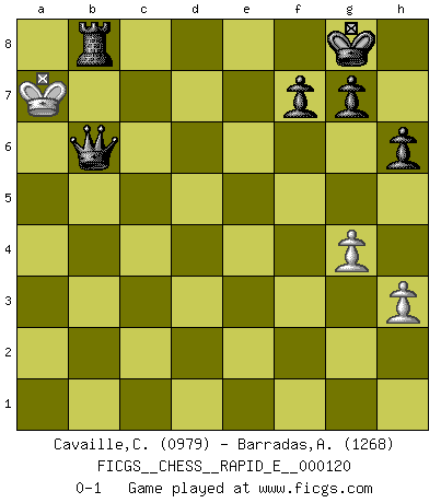 Last move : 0-1 2013 December 4 22:14:29 [Event "FICGS__CHESS__RAPID_E__000120"] [Site "FICGS"] [Date "2013.12.01"] [Round "1"] [White "Cavaille,Cedric"] [Black "Barradas,Anderson"] [Result "0-1"] [WhiteElo "0979"] [BlackElo "1268"] 1.e4 e5 2.Nf3 Nf6 3.Nxe5 d6 4.Nf3 Nxe4 5.Qe2 Qe7 6.d3 Nf6 7.Qxe7+ Bxe7 8.Bg5 h6 9.Bxf6 Bxf6 10.c3 O-O 11.d4 Bf5 12.Be2 Nd7 13.O-O Rfe8 14.Re1 a6 15.b4 b6 16.Nbd2 c5 17.dxc5 dxc5 18.Nc4 cxb4 19.Bd1 Rxe1+ 20.Nxe1 Bxc3 21.Bf3 Re8 22.Kf1 Bxa1 23.h3 Bc3 24.Be2 Bxe1 25.Kxe1 Bd3 26.Ne3 Bxe2 27.Kxe2 Nc5 28.f4 b3 29.axb3 Nxb3 30.g4 a5 31.Kd3 a4 32.Nc4 b5 33.Na5 Nxa5 34.Kc3 a3 35.Kb4 a2 36.Kxa5 a1Q+ 37.Kxb5 Qf1+ 38.Kc5 Qxf4 39.Kd5 Rd8+ 40.Kc6 Qd4 41.Kc7 Qd6+ 42.Kb7 Rb8+ 43.Ka7 Qb6+ 0-1 Petrov : Cozio (Lasker) attack Kingside Castling by player Black (move 10) Kingside Castling by player White (move 13) Promotion Queen by player Black (move 36) 10 pieces endgame at move 37 : White KPPP , Black KQRPPP WHITE : King + 3 Pawns BLACK : King + 1 Queen 1 Rook 3 Pawns 9 pieces endgame at move 38 : White KPP , Black KQRPPP WHITE : King + 2 Pawns BLACK : King + 1 Queen 1 Rook 3 Pawns Player Black won this chess game. Follow this game move after move (download)We must make sure that Chess will not be like a dead language, very interesting, but for a very small group. (Sytze Faber) Ein guter Spieler hat immer Glück. (José Raúl Capablanca) Tu sabes, camarada Pachman, no disfruto el ser un Ministro, preferería jugar al Ajedrez como tu. (Che Guevara) Demandez au pauvre Cg1 ce qu'il en pense. Eduard Gufeld à propos de la variante Saemisch de l'Est-Indienne. As the days dwindle down... to a precious few. (Maxwell Anderson)