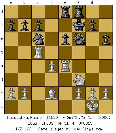 Last move : 1/2-1/2 2007 May 7 20:10:56 [Event "FICGS__CHESS__RAPID_A__000013"] [Site "FICGS"] [Date "2007.02.09"] [Round "1"] [White "Haluschka,Rainer"] [Black "Smith,Martin"] [Result "1/2-1/2"] [WhiteElo "1820"] [BlackElo "2000"] 1.c4 Nc6 2.d4 d5 3.Nc3 dxc4 4.Nf3 Nf6 5.e3 e5 6.Bxc4 exd4 7.exd4 Bd6 8.Qe2+ Qe7 9.Qxe7+ Nxe7 10.O-O O-O 11.Bg5 Be6 12.Bxe6 fxe6 13.Rfe1 Kf7 14.Bd2 h6 15.Na4 Nc6 16.Rac1 Nd5 17.Re4 Rae8 18.Nc5 Bxc5 19.Rxc5 Nf6 20.Re1 Nd5 21.Re4 Nf6 1/2-1/2 English Opening Kingside Castling by player White (move 10) Kingside Castling by player Black (move 10) This chess game ended in a draw. Follow this game move after move (download)Alekhine is a poet who creates a work of art out of something that would hardly inspire another man to send home a picture post card. (Max Euwe) Ich spiele 70 Eröffnungssysteme. (Viktor Kortschnoi) ¿Esta Bobby Fischer algo cuerdo?. (Salo Flohr) Les pièces de l'échiquier étaient impitoyables. Elles le retenaient, elles l'absorbaient. Il y avait de l'horreur en cela, mais aussi une harmonie unique. Car, qu'y a-t-il dans le monde, à part les échecs ? (V. Nabokov) Life is the sum of all your choices. (Albert Camus)