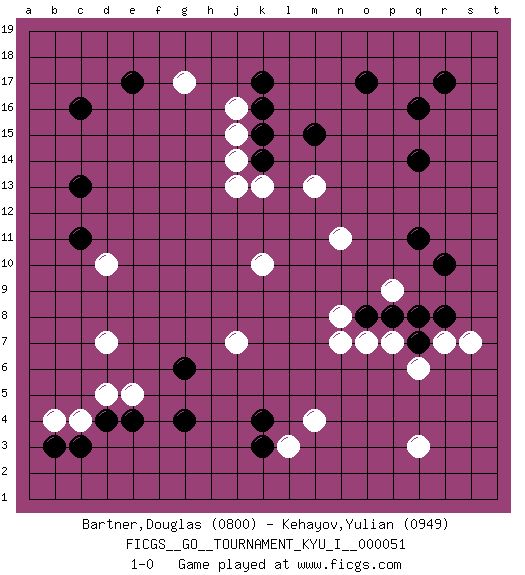 Last move : 1-0 2014 March 27 17:5:3 [Event "FICGS__GO__TOURNAMENT_KYU_I__000051"] [Site "FICGS"] [Date "2013.12.01"] [Round "1"] [Black "Bartner,Douglas"] [White "Kehayov,Yulian"] [Result "1-0"] [Rating 1 "0800"] [Rating 2 "0949"] 1.q16 c4 2.c16 q3 3.e4 d7 4.g4 m4 5.c3 b4 6.b3 d10 7.c13 r7 8.r10 k10 9.q14 p9 10.k4 l3 11.k3 e5 12.d4 d5 13.k17 g17 14.e17 j16 15.k16 j15 16.k15 j14 17.k14 j13 18.o17 m13 19.m15 k13 20.q11 n11 21.q8 p7 22.q7 q6 23.p8 o7 24.o8 n7 25.r8 s7 26.r17 n8 27.g6 j7 28.c11 1-0 Comment by player 1 : Douglas Bartner : How do I move? Press r16 on my iPad but nothing happens. Here are the names of the openings (joseki) played in the four corners : Corner d4 : c4 e4 Komoku (Somok, Xiao~mu`) 3-4 Point. The komoku (3-4) point is the traditional corner enclosure move.. Ikken Takagakari (Hankan Nop'dakeolch'im, Yi Gaogua`jiao~, 1-Space High Approach). The 5-4 approach move has become more popular in modern times, as modern Go emphasizes speed and influence. Player Black won this Go (weiqi, baduk) game. Follow this game move after move (download)The nature of a game comes from what is played, but it's the sensitivity to the possible and the impossible that gives it value. (Pierre Audouard) The arrogant army will lose certainly the battle. (Chinese proverb)