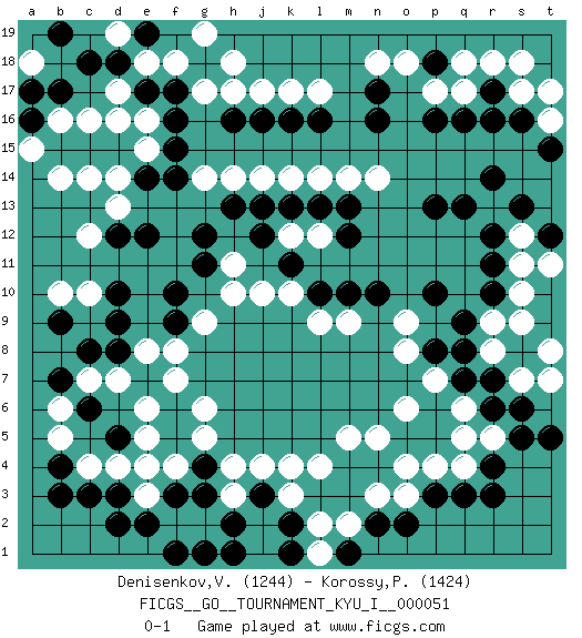 Last move : 0-1 2014 January 31 19:55:46 [Event "FICGS__GO__TOURNAMENT_KYU_I__000051"] [Site "FICGS"] [Date "2013.12.01"] [Round "1"] [Black "Denisenkov,Valentin"] [White "Korossy,Peter"] [Result "0-1"] [Rating 1 "1244"] [Rating 2 "1424"] 1.q16 d4 2.r3 q4 3.q3 p4 4.p3 o3 5.r4 r5 6.o2 n3 7.n2 d16 8.f3 h3 9.c3 c4 10.d3 e4 11.g3 e3 12.e2 f2 13.d2 g2 14.b4 b5 15.b3 c7 16.f17 h17 17.f15 d14 18.j16 j17 19.k16 k17 20.l16 l17 21.h16 k12 22.g12 h11 23.g11 h10 24.d12 g14 25.f14 j14 26.d9 d17 27.h13 h14 28.j13 k14 29.k13 l14 30.l13 m14 31.l10 l12 32.m13 n14 33.n16 n18 34.j12 k10 35.k11 j10 36.m12 r13 37.r10 r8 38.p10 o9 39.q8 r9 40.q9 l9 41.p13 s10 42.r11 s11 43.r12 s12 44.q13 p7 45.r14 q18 46.p18 p17 47.p16 q17 48.n17 o18 49.c15 c14 50.d15 e15 51.e14 e16 52.b15 b14 53.b17 b16 54.d18 e18 55.c18 a15 56.e17 f18 57.g18 g17 58.f16 g19 59.e19 h18 60.b19 a18 61.a17 d19 62.e7 f8 63.f9 e8 64.d8 g9 65.f10 d7 66.l3 k4 67.m3 m5 68.n4 o4 69.m4 n5 70.j3 k3 71.h2 h4 72.g1 j2 73.f1 f4 74.g4 g5 75.f5 g6 76.f6 f7 77.r7 s7 78.s8 s9 79.s6 t8 80.s5 q6 81.p8 o8 82.r6 q5 83.q7 o6 84.m10 m9 85.n10 b10 86.k2 j1 87.k1 j4 88.h1 l2 89.j3 m2 90.m1 l4 91.a16 c16 92.b9 c10 93.d10 c12 94.b7 b6 95.c8 d13 96.e12 s17 97.s16 t16 98.t15 t17 99.r17 r18 100.r16 s18 101.s13 l1 102.t12 t11 103.t5 t7 104.d5 e5 105.c6 e6 0-1 Here are the names of the openings (joseki) played in the four corners : Corner q4 : r3 q4 San-San (Sam-Sam, San-San) 3-3 Point. The San-San (3-3) point, emphasizing territory at the expense of influence. Kata-tsuki (shoulder hit). The shoulder-hit is the traditional answer to the 3-3. The direction of Black 3 depends on the positions on the side. Crawling once may be the premise for a follow-up move of sliding with a knight's move in the opposite direction. If Black plays 3 at 3-4 (to the right), the follow-on knight's move is then played at the top (e.g. 3-4, 4-5, 5-2). Black's knight's move reduces territory potential on the side it is played. Corner d4 : d4 f3 Hoshi (Hwajeom, Seongjeom, Xingwei`) 4-4 Point. The star or hoshi (4-4) point, emphasizing influence at the potential expense of territory. Ikken Kakari (Hankan Keolch'im, Yi Gua`jiao~, 1-Space Low Approach). Black 2 is the standard approach move to the 4-4. Corner d16 : d16 f17 Hoshi (Hwajeom, Seongjeom, Xingwei`) 4-4 Point. The star or hoshi (4-4) point, emphasizing influence at the potential expense of territory. Ikken Kakari (Hankan Keolch'im, Yi Gua`jiao~, 1-Space Low Approach). Black 2 is the standard approach move to the 4-4. Player White won this Go (weiqi, baduk) game. Follow this game move after move (download)... {it is} something unearthly... if there are sentient beings on other planets, then they play go. (Emanuel Lasker, chess world champion) Train yourself to let go of everything you fear to lose. (Master Yoda in Star Wars ep.3)