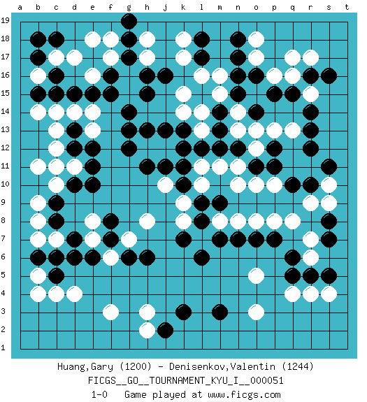 Last move : 1-0 2014 April 23 6:54:2 [Event "FICGS__GO__TOURNAMENT_KYU_I__000051 "] [Site "FICGS"] [Date "2013.12.01"] [Round "1"] [Black "Huang,Gary "] [White "Denisenkov,Valentin "] [Result "1-0"] [Rating 1 "1200"] [Rating 2 "1244"] 1.q15 d4 2.d6 f3 3.d15 d17 4.f16 f17 5.g17 g16 6.e17 f18 7.f15 e18 8.h16 e16 9.e15 c10 10.c8 c13 11.b15 b5 12.c5 c4 13.b6 b4 14.e10 e13 15.d12 c12 16.d13 c14 17.c15 d11 18.e11 b9 19.d10 b8 20.c11 b11 21.c9 d11 22.g18 c11 23.c18 c17 24.b17 b16 25.b18 c7 26.d7 b7 27.c6 q4 28.q6 o3 29.k3 h3 30.m3 o5 31.l6 q17 32.o16 r15 33.r16 r17 34.s16 o17 35.n17 o18 36.n18 p16 37.p15 o15 38.n16 q16 39.r14 d14 40.e12 e14 41.g13 b14 42.c16 g15 43.g14 q8 44.p7 p8 45.o7 r6 46.r5 r7 47.q5 r4 48.s5 s4 49.r10 r9 50.q10 p10 51.p11 o10 52.o11 o8 53.n7 n8 54.m7 n11 55.n12 m11 56.m12 h17 57.h15 h8 58.h6 k9 59.j2 h2 60.l9 l10 61.m9 n10 62.k10 j10 63.k11 k8 64.s8 s9 65.s7 l7 66.k7 m8 67.l8 s10 68.s11 l11 69.l12 k12 70.j11 o12 71.p12 o13 72.k13 j12 73.h11 l13 74.m13 l14 75.m14 m15 76.l15 k14 77.j13 h12 78.h13 n14 79.g12 p13 80.r12 q13 81.r13 n13 82.k12 l16 83.n15 k15 84.l17 k17 85.l18 k18 86.j16 h18 87.g19 m16 88.o14 f6 89.f7 g7 90.g6 e7 91.f8 e8 92.e6 1-0 Here are the names of the openings (joseki) played in the four corners : Corner d4 : d4 d6Hoshi (Hwajeom, Seongjeom, Xingwei`) 4-4 Point. The star or hoshi (4-4) point, emphasizing influence at the potential expense of territory.Ikken Takagakari (Hankan Nop'dakeolch'im, Yi Gaojia, 1-Space High Approach). White typically responds at 6-4 or 3-10. White 4-10 is played when White finds play on the right side advantageous. White 4-8 or 3-8 may be played when White has support at top. Corner d16 : d15 d17Takamoku (Gomok, Gaomu`) 5-4 Point. The takamoku (high) point (5-4). With its emphasis on influence, the 5-4 point complements the 4-4 (hoshi) point in creating an influence-oriented fuseki.Komoku. Black responds with 3-3, 3-5, 4-6, 4-7, 3-6, 3-7. Corner q4 : q4 q6Hoshi (Hwajeom, Seongjeom, Xingwei`) 4-4 Point. The star or hoshi (4-4) point, emphasizing influence at the potential expense of territory.Ikken Takagakari (Hankan Nop'dakeolch'im, Yi Gaojia, 1-Space High Approach). White typically responds at 6-4 or 3-10. White 4-10 is played when White finds play on the right side advantageous. White 4-8 or 3-8 may be played when White has support at top. Corner q16 : q15 q17Takamoku (Gomok, Gaomu`) 5-4 Point. The takamoku (high) point (5-4). With its emphasis on influence, the 5-4 point complements the 4-4 (hoshi) point in creating an influence-oriented fuseki.Komoku. Black responds with 3-3, 3-5, 4-6, 4-7, 3-6, 3-7. Player Black won this Go (weiqi, baduk) game.Follow this game move after move (download ) Avoid the plate connection. (Anonymous) He who is a good ruler must first have been ruled. (Aristotle)