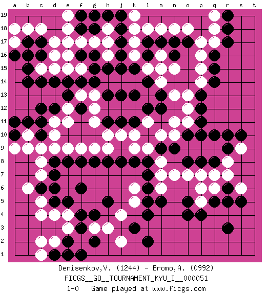 Last move : 1-0 2014 January 29 19:54:37 [Event "FICGS__GO__TOURNAMENT_KYU_I__000051"] [Site "FICGS"] [Date "2013.12.01"] [Round "1"] [Black "Denisenkov,Valentin"] [White "Bromo,Alexis"] [Result "1-0"] [Rating 1 "1244"] [Rating 2 "0992"] 1.q16 d4 2.r3 d16 3.f3 e3 4.f4 e4 5.f6 d10 6.l4 k16 7.q10 k10 8.c14 c15 9.d14 d15 10.c11 d11 11.c10 c9 12.d12 e12 13.c12 e9 14.e13 f13 15.f12 e11 16.f14 g13 17.b15 b16 18.b14 g11 19.g14 h14 20.g16 e16 21.d8 d9 22.d6 c5 23.c6 b6 24.d5 c4 25.g8 g9 26.f8 f9 27.h8 h9 28.k8 k9 29.l8 l9 30.m9 m10 31.n9 n10 32.o10 o11 33.p11 o12 34.p12 o13 35.p13 p14 36.q14 p15 37.q15 p16 38.q5 r7 39.r6 r8 40.r9 q7 41.p8 p7 42.o5 o7 43.o8 n7 44.l6 m7 45.l7 s9 46.s10 s6 47.s5 q6 48.r5 q9 49.r10 p9 50.q8 o9 51.p10 q17 52.r17 q18 53.r18 q19 54.r19 f2 55.g2 g17 56.f16 f17 57.h13 g12 58.h15 j14 59.j15 k14 60.j17 h17 61.k15 l15 62.j16 h16 63.l16 k17 64.l14 m15 65.k13 l13 66.j13 m14 67.o17 p17 68.l17 k18 69.j18 l18 70.n16 m16 71.m17 m18 72.n17 n18 73.m13 n15 74.l12 n13 75.e2 d2 76.f1 c8 77.e8 c7 78.f19 h18 79.h19 k19 80.j19 f15 81.g15 e15 82.e14 e18 83.c17 d17 84.f18 e19 85.b17 c18 86.c16 b18 87.a16 a18 88.g19 e17 89.g18 a17 90.b16 b10 91.b11 b9 92.d1 c1 93.e1 c2 94.j11 j10 95.k11 l11 96.m12 n11 97.e5 o18 98.h11 h10 99.a10 a9 100.a11 p5 101.p4 p6 102.o4 m6 103.m5 m8 104.d7 j2 105.l2 h3 106.h5 j4 107.k3 k5 108.l5 k6 109.j8 g3 110.g4 1-0 Here are the names of the openings (joseki) played in the four corners : Corner d4 : d4 f3 Hoshi (Hwajeom, Seongjeom, Xingwei`) 4-4 Point. The star or hoshi (4-4) point, emphasizing influence at the potential expense of territory. Ikken Kakari (Hankan Keolch'im, Yi Gua`jiao~, 1-Space Low Approach). Black 2 is the standard approach move to the 4-4. Corner d16 : d16 c14 Hoshi (Hwajeom, Seongjeom, Xingwei`) 4-4 Point. The star or hoshi (4-4) point, emphasizing influence at the potential expense of territory. Ikken Kakari (Hankan Keolch'im, Yi Gua`jiao~, 1-Space Low Approach). Black 2 is the standard approach move to the 4-4. Corner q16 : q16 o11 Hoshi (Hwajeom, Seongjeom, Xingwei`) 4-4 Point. The star or hoshi (4-4) point, emphasizing influence at the potential expense of territory. Player Black won this Go (weiqi, baduk) game. Follow this game move after move (download)There is no territory in the centre. (Anonymous) Sometimes it pays to stay in bed in Monday, rather than spending the rest of the week debugging Monday's code. (Dan Salomon)