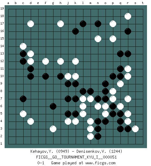 Last move : 0-1 2014 March 28 5:10:4 [Event "FICGS__GO__TOURNAMENT_KYU_I__000051"] [Site "FICGS"] [Date "2013.12.01"] [Round "1"] [Black "Kehayov,Yulian"] [White "Denisenkov,Valentin"] [Result "0-1"] [Rating 1 "0949"] [Rating 2 "1244"] 1.r16 d4 2.q3 d17 3.q10 p17 4.d10 d12 5.c7 c5 6.n3 k4 7.n17 p15 8.q13 r18 9.l17 n15 10.k16 h17 11.c12 d13 12.c13 c14 13.d11 f12 14.f10 h12 15.h10 k12 16.j7 r5 17.q5 q6 18.p5 r4 19.q4 r7 20.p6 p7 21.o7 p8 22.o8 q9 23.p10 r10 24.q11 r11 25.r13 g3 26.g6 k10 27.k9 j10 28.j9 l6 29.j5 j4 30.k5 l5 31.k7 n6 32.n7 m7 33.m8 m4 34.n4 o6 35.o9 o5 36.o4 l7 37.l8 m3 38.n2 m2 39.r3 s3 0-1 Here are the names of the openings (joseki) played in the four corners : Corner q16 : r16 p17 Komoku (Somok, Xiao~mu`) 3-4 Point. The komoku (3-4) point is the traditional corner enclosure move.. Ikken Kakari (Hankan Keolch'im, Yi Gua`jiao~, 1-Space Low Pincer). The small knight move is the basic approach move to the 3-4 point stone. It has been continually used for over four centuries. There are limitless variations, with new moves constantly being discovered. White 2 opens the door to a treaure store of joseki. Corner d4 : d4 c7 Hoshi (Hwajeom, Seongjeom, Xingwei`) 4-4 Point. The star or hoshi (4-4) point, emphasizing influence at the potential expense of territory. Niken Kakari (Dukan Keolch'im, E`r Gua`jiao~, 2-Space Low Approach). White typically answers by 7-3 or 3-5 (which is not joseki). Player White won this Go (weiqi, baduk) game. Follow this game move after move (download)Fighting must not be the key to go, it should be reserved as your last resource. (Zhong-Pu Liu, about Weiqi) Either move or be moved. (Ezra Pound)