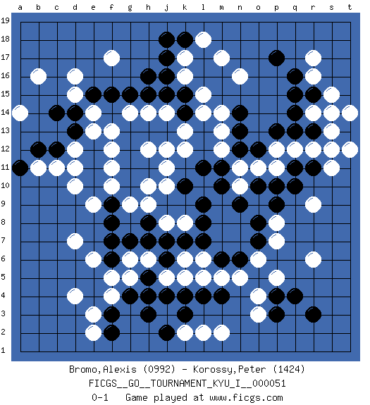 Last move : 0-1 2014 March 1 10:3:33 [Event "FICGS__GO__TOURNAMENT_KYU_I__000051"] [Site "FICGS"] [Date "2013.12.01"] [Round "1"] [Black "Bromo,Alexis"] [White "Korossy,Peter"] [Result "0-1"] [Rating 1 "0992"] [Rating 2 "1424"] 1.q16 d4 2.q4 d16 3.k4 k16 4.q10 d10 5.k10 o3 6.g7 k6 7.g13 h9 8.g10 g9 9.h8 j8 10.j7 k8 11.l9 h10 12.h11 j11 13.g12 e13 14.f15 f17 15.h16 n16 16.n14 m13 17.n12 r17 18.p17 r16 19.r15 s15 20.s14 r14 21.q15 s13 22.q14 t14 23.r13 s14 24.s12 r12 25.q13 s11 26.r11 q12 27.q11 p12 28.p13 o11 29.o12 p11 30.p10 r6 31.r3 p5 32.p4 o4 33.p3 k12 34.l11 n11 35.o10 n10 36.n9 p8 37.o8 r9 38.m10 t12 39.m11 s12 40.k7 l6 41.l7 h6 42.h7 g6 43.f7 d7 44.f6 f5 45.f9 h12 46.g11 j10 47.l8 f10 48.e10 f11 49.e11 f12 50.e12 f13 51.d13 e9 52.f8 e14 53.d14 d12 54.e15 d11 55.j6 j5 56.h5 g5 57.h4 k5 58.m6 m5 59.j4 l5 60.l4 m2 61.m4 n5 62.n6 o6 63.o7 p7 64.p9 e6 65.g4 f4 66.f3 e3 67.f2 k2 68.j2 e2 69.k3 l2 70.h3 m14 71.h13 j12 72.j13 k13 73.k14 l14 74.k15 l15 75.j16 k17 76.j17 m12 77.n13 g14 78.g15 j14 79.j15 h14 80.h15 d15 81.c14 b16 82.c12 c11 83.b12 b11 84.a11 a14 85.k18 l18 86.j18 m17 0-1 Here are the names of the openings (joseki) played in the four corners : Corner q4 : q4 o3 Hoshi (Hwajeom, Seongjeom, Xingwei`) 4-4 Point. The star or hoshi (4-4) point, emphasizing influence at the potential expense of territory. Ikken Kakari (Hankan Keolch'im, Yi Gua`jiao~, 1-Space Low Approach). White 2 is the standard approach move to the 4-4. Corner d4 : d4 g7 Hoshi (Hwajeom, Seongjeom, Xingwei`) 4-4 Point. The star or hoshi (4-4) point, emphasizing influence at the potential expense of territory. Corner d16 : d16 g13 Hoshi (Hwajeom, Seongjeom, Xingwei`) 4-4 Point. The star or hoshi (4-4) point, emphasizing influence at the potential expense of territory. Corner q16 : q16 n16 Hoshi (Hwajeom, Seongjeom, Xingwei`) 4-4 Point. The star or hoshi (4-4) point, emphasizing influence at the potential expense of territory. Niken Takagakari (Dukan Nop'dakeolch'im, E`r Gaojia, 2-Space High Approach). White 2 is a light approach move. Rarely played in even games, White 2 is typically employed in handicap games. Black continues with 6-4 or 3-10. In Korean Sunjang Baduk Black has a stone on 8-4. Player White won this Go (weiqi, baduk) game. Follow this game move after move (download)Good moves and bad moves are bedfellows. (Anonymous) Coffee just isn't my cup of tea. (Unknown)