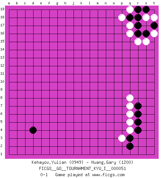 Last move : 0-1 2014 March 28 17:38:59 [Event "FICGS__GO__TOURNAMENT_KYU_I__000051"] [Site "FICGS"] [Date "2013.12.01"] [Round "1"] [Black "Kehayov,Yulian"] [White "Huang,Gary"] [Result "0-1"] [Rating 1 "0949"] [Rating 2 "1200"] 1.r16 q16 2.q3 r15 3.r17 q17 4.r18 s15 5.q18 p18 6.s16 q19 7.r19 t16 8.t17 s18 9.s19 t18 10.d4 q5 11.r4 p3 12.q2 q4 13.r5 q6 14.r6 q7 15.r7 q8 0-1 Here are the names of the openings (joseki) played in the four corners : Corner q16 : r16 q16 Komoku (Somok, Xiao~mu`) 3-4 Point. The komoku (3-4) point is the traditional corner enclosure move.. Corner q4 : q3 q5 Komoku (Somok, Xiao~mu`) 3-4 Point. The komoku (3-4) point is the traditional corner enclosure move.. Ikken Takagakari (Hankan Nop'dakeolch'im, Yi Gaogua`jiao~, 1-Space High Approach). The 5-4 approach move has become more popular in modern times, as modern Go emphasizes speed and influence. Player White won this Go (weiqi, baduk) game. Follow this game move after move (download)A meijin needs no joseki. (Anonymous) Those who make the worst use of their time are the first to complain of its brevity. (Jean de la Bruyere)