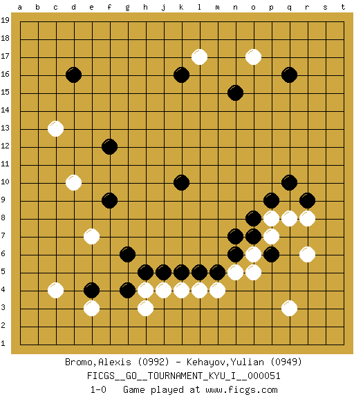 Last move : 1-0 2014 March 29 5:42:37 [Event "FICGS__GO__TOURNAMENT_KYU_I__000051"] [Site "FICGS"] [Date "2013.12.01"] [Round "1"] [Black "Bromo,Alexis"] [White "Kehayov,Yulian"] [Result "1-0"] [Rating 1 "0992"] [Rating 2 "0949"] 1.q16 c4 2.d16 q3 3.q10 d10 4.k16 j4 5.k10 r6 6.n7 n5 7.g6 o17 8.n15 l17 9.f12 c13 10.f9 e7 11.l5 l4 12.g4 h3 13.e4 e3 14.p6 r8 15.r9 q8 16.p9 p8 17.o8 p7 18.o7 o6 19.n6 o5 20.m5 m4 21.k5 k4 22.j5 h4 23.h5 1-0 Here are the names of the openings (joseki) played in the four corners : Corner q16 : q16 o17 Hoshi (Hwajeom, Seongjeom, Xingwei`) 4-4 Point. The star or hoshi (4-4) point, emphasizing influence at the potential expense of territory. Ikken Kakari (Hankan Keolch'im, Yi Gua`jiao~, 1-Space Low Approach). White 2 is the standard approach move to the 4-4. Player Black won this Go (weiqi, baduk) game. Follow this game move after move (download)If you lose by one point, take a rest. (Anonymous) Ah, the Socrating method. The best way we have of teaching everything-apart from juggling chainsaws. (Gregory House, House M.D.)