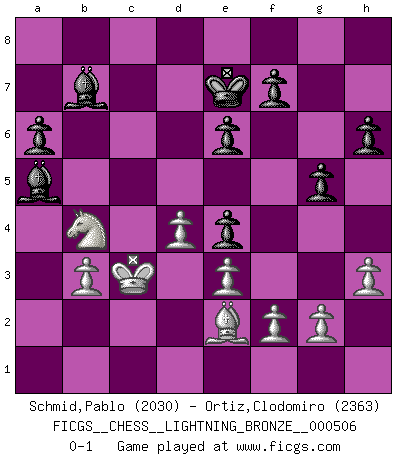 Last move : 0-1 2013 December 2 0:29:30 [Event "FICGS__CHESS__LIGHTNING_BRONZE__000506"] [Site "FICGS"] [Date "2013.12.01"] [Round "1"] [White "Schmid,Pablo"] [Black "Ortiz,Clodomiro"] [Result "0-1"] [WhiteElo "2030"] [BlackElo "2363"] 1.Nf3 d5 2.d4 Nf6 3.c4 e6 4.Nc3 Be7 5.Bf4 O-O 6.e3 c6 7.Qc2 Nbd7 8.h3 h6 9.a3 b6 10.cxd5 cxd5 11.Be2 Bb7 12.O-O Rc8 13.Rfc1 a6 14.Qd1 b5 15.Ne1 Ne4 16.a4 b4 17.Nxe4 dxe4 18.Rxc8 Qxc8 19.Rc1 Qa8 20.a5 Bc6 21.Qb3 Nf6 22.Be5 Rc8 23.Rc2 Bd5 24.Rxc8+ Qxc8 25.Qc2 Qb7 26.b3 Bd8 27.Qa2 Qc6 28.Qc2 Bxa5 29.Qxc6 Bxc6 30.Bd6 Bb7 31.Nc2 Nd5 32.Bc4 g5 33.Kf1 Kg7 34.Ke2 Nc3+ 35.Kd2 Na2 36.Bf1 Kf6 37.Be2 Bd8 38.Bxb4 Nxb4 39.Nxb4 Ba5 40.Kc3 Ke7 0-1 Reti Opening Kingside Castling by player Black (move 5) Kingside Castling by player White (move 12) Player Black won this chess game. Follow this game move after move (download)In Chess, at least, the brave inherit the earth. (Edmar Mednis) Wenn Schach ein enormer Dschungel ist, der seine Myriaden von Geheimnissen nicht preisgeben will, dann sind Computer die Kettensägen einer gewaltigen ökologisch unsensiblen Nutzholzfirma. (Nigel Short) Antes de los Finales, los dioses han colocado el Juego Medio. (Siegbert Tarrasch) Les Echecs représentent une sphère d'idées créatrices basée sur la volonté des deux protagonistes. (Smyslov) Luck is the residue of design. (John Milton)