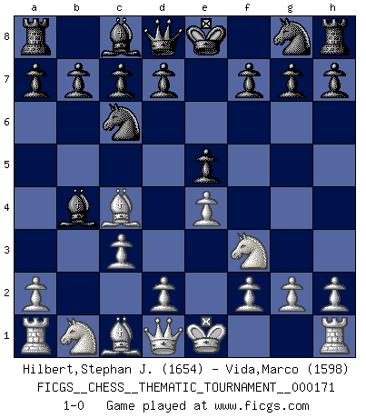 Last move : 1-0 2014 February 1 0:10:51 [Event "FICGS__CHESS__THEMATIC_TOURNAMENT__000171"] [Site "FICGS"] [Date "2013.12.02"] [Round "1"] [White "Hilbert,Stephan J."] [Black "Vida,Marco"] [Result "1-0"] [WhiteElo "1654"] [BlackElo "1598"] 1.e4 e5 2.Nf3 Nc6 3.Bc4 Bc5 4.b4 Bxb4 5.c3 1-0 This chess game has been lost on time (started : 2013.12.02 11:15:42) Evans gambit Player White won this chess game. Follow this game move after move (download)Chess problems demand from the composer the same virtues that characterize all worthwhile art: originality, invention, conciseness, harmony, complexity, and splendid insincerity. (Vladimir Nabokov) Ich würde mich als ganz normalen Jungen bezeichnen [Im Alter von 12]. (Sergej Karjakin) El Ajedrez es una manera fabulosa para que los niños aprendan a autovalorarse y a autoestimarse. (Saudin Robovic) Même un GMI sait rarement calculer sur plus de cinq coups une attaque à sacrifices. (Rudolf Spielmann) Luck never made a man wise. (Seneca, Letters to Lucilius)