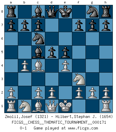 Last move : 0-1 2014 February 8 12:46:30 [Event "FICGS__CHESS__THEMATIC_TOURNAMENT__000171"] [Site "FICGS"] [Date "2013.12.02"] [Round "1"] [White "Zmolil,Josef"] [Black "Hilbert,Stephan J."] [Result "0-1"] [WhiteElo "1321"] [BlackElo "1654"] 1.e4 e5 2.Nf3 Nc6 3.Bc4 Bc5 4.b4 d5 0-1 Evans counter-gambit Player Black won this chess game. Follow this game move after move (download)Chess, like love, is infectious at any age. (Flohr) Sie bekommen vielleicht den Eindruck, dass die Spitzenspieler überhaupt gar nicht so stark sind. Aber das stimmt nicht. Es ist eine Illusion. Mit einem Computer an der Seite ist es sehr leicht, Urteile zu fällen, aber wenn man alleine am Brett sitzt, sieht die Sache ganz anders aus. (Vladimir Kramnik) El Ajedrez es el gimnasio de la mente. (Blaise Pascal) Je fais ceci parce que dans cinquante coups j'obtiendrai cela; je m'appelle Mikhail Moisevitch Botvinnik. (Botvinnik) Whoever said the pen is mightier than the sword obviously never encountered automatic weapons. (US General Douglas MacArthur)