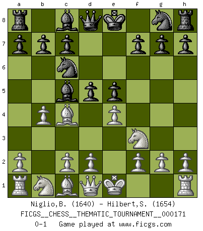 Last move : 0-1 2014 February 3 12:31:38 [Event "FICGS__CHESS__THEMATIC_TOURNAMENT__000171"] [Site "FICGS"] [Date "2013.12.02"] [Round "1"] [White "Niglio,Biagio"] [Black "Hilbert,Stephan J."] [Result "0-1"] [WhiteElo "1640"] [BlackElo "1654"] 1.e4 e5 2.Nf3 Nc6 3.Bc4 Bc5 4.b4 d5 0-1 This chess game has been lost on time (started : 2013.12.02 11:15:42) Evans counter-gambit Player Black won this chess game. Follow this game move after move (download)Good positions don't win games, good moves do. (Gerald Abrahams) Wie ich sie so einen nach dem anderen nieder mähte wurde meine Überlegenheit offensichtlich. (José Raúl Capablanca) El juego de Damas es para vagabundos. (Paul Morphy) En blitz, le Cavalier l'emporte sur le Fou. (Vlastimil Hort) CHESS, n. f. [echecs, Fr.] A nice and abstruse game, in which two sets of puppets are moved in opposition to each other. (Dr Samuel Johnson, A Dictionary Of The English Language, 1755)