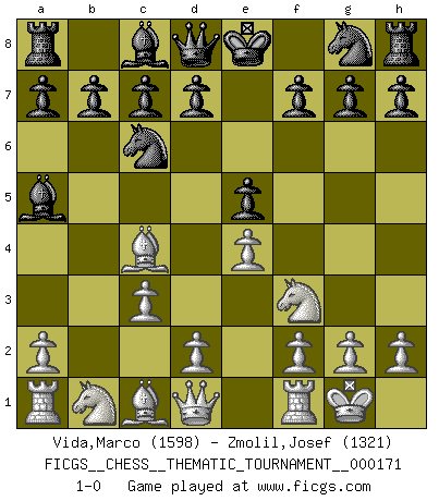 Last move : 1-0 2014 February 8 12:46:38 [Event "FICGS__CHESS__THEMATIC_TOURNAMENT__000171"] [Site "FICGS"] [Date "2013.12.02"] [Round "1"] [White "Vida,Marco"] [Black "Zmolil,Josef"] [Result "1-0"] [WhiteElo "1598"] [BlackElo "1321"] 1.e4 e5 2.Nf3 Nc6 3.Bc4 Bc5 4.b4 Bxb4 5.c3 Ba5 6.O-O 1-0 Evans gambit Kingside Castling by player White (move 6) Player White won this chess game. Follow this game move after move (download)Dazzling combinations are for the many, shifting wood is for the few. (Georg Kieninger) Schach ist das schnellste Spiel der Welt, weil man in jeder Sekunde Tausende von Gedanken ordnen muß. (Albert Einstein) La caracteristica mas importante en la posición del Ajedrez es la actividad de las piezas. Esto es absolutamente fundamental en todas las fases del juego: Apertura, Juego Medio y especialmente Finales. La limitación primordial en la actividad de una pieza, es la estructuración de los Peones. (Michael Stean) C'est une question de caractère, Beaucoup de gens perdent leur motivation très vite. D'autres, ils sont rares, peuvent la conserver très longtemps. J'aime les échecs, encore aujourd'hui je suis heureux d'analyser des parties. J'aime toujours gagner, je déteste encore perdre. Bien jouer est important pour mon intégrité intellectuelle et morale. Et puis les échecs vivent en ce moment une période historique grâce à Internet. Ils se développent dans les systèmes éducatifs à travers le monde. Ils sortent de leur ghetto, et c'est mon rôle de mener à bien cette révolution. (Gary Kasparov) When a man with money meets a man with experience, the man with experience leaves with money and the man with money leaves with experience. (Anonymous)