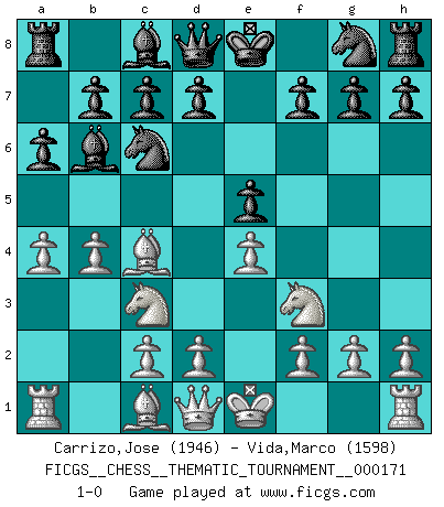 Last move : 1-0 2014 January 18 11:17:46 [Event "FICGS__CHESS__THEMATIC_TOURNAMENT__000171"] [Site "FICGS"] [Date "2013.12.02"] [Round "1"] [White "Carrizo,Jose"] [Black "Vida,Marco"] [Result "1-0"] [WhiteElo "1946"] [BlackElo "1598"] 1.e4 e5 2.Nf3 Nc6 3.Bc4 Bc5 4.b4 Bb6 5.a4 a6 6.Nc3 1-0 This chess game has been lost on time (started : 2013.12.02 11:15:42) Evans gambit declined, Showalter variation Player White won this chess game. Follow this game move after move (download)By playing at Chess then, we may learn: First: Foresight... Second: Circumspection... Third: Caution... And lastly, we learn by Chess the habit of not being discouraged by present bad appearances in the state of our affairs, the habit of hoping for a favorable chance, and that of persevering in the secrets of resources. (Benjamin Franklin) Die Partien sind immer verschieden, die Interviews immer die gleichen. (Garry Kasparov) El Ajedrez es un expediente tonto que hace creer a la gente inactiva que hacen una cosa muy astuta cuando solamente estan perdiendo su tiempo. (George Bernard Shaw) Fischer est le meilleur joueur du monde et Karpov n'est qu'un joueur de bistrot. (Garry Kasparov, agé de 16 ans) In my experience, there's no such thing as luck. (Obi-Wan Kenobi in Star Wars ep.4)